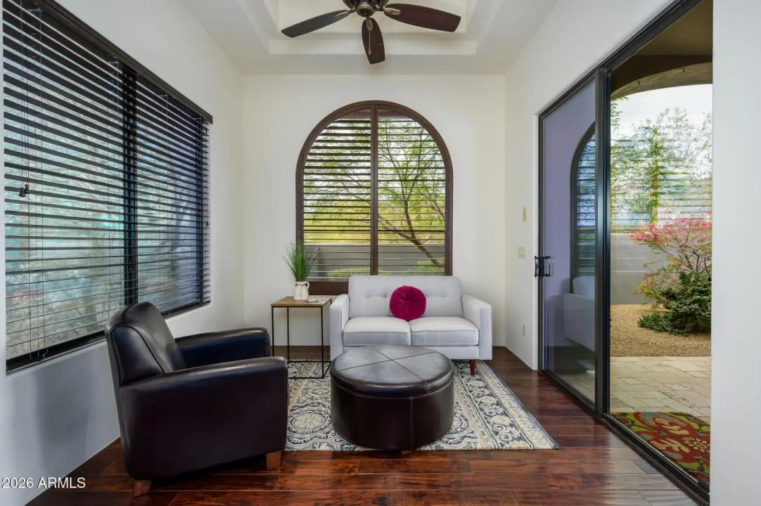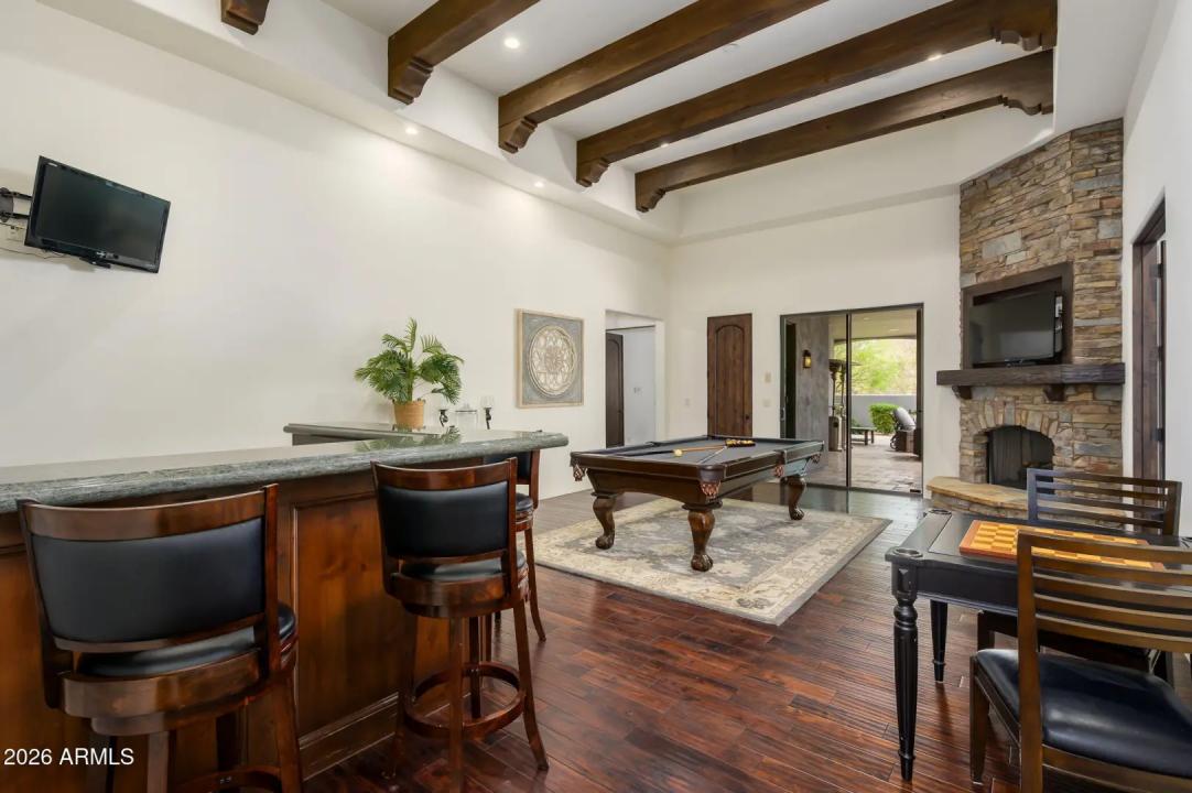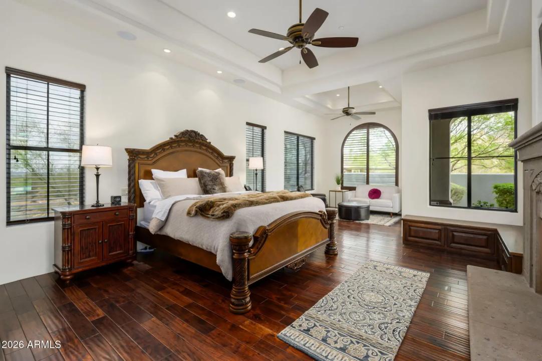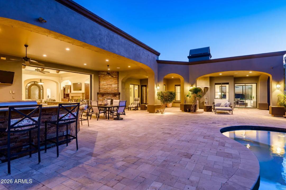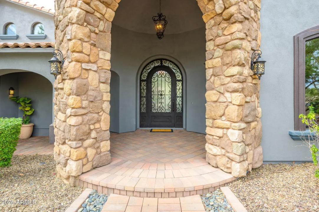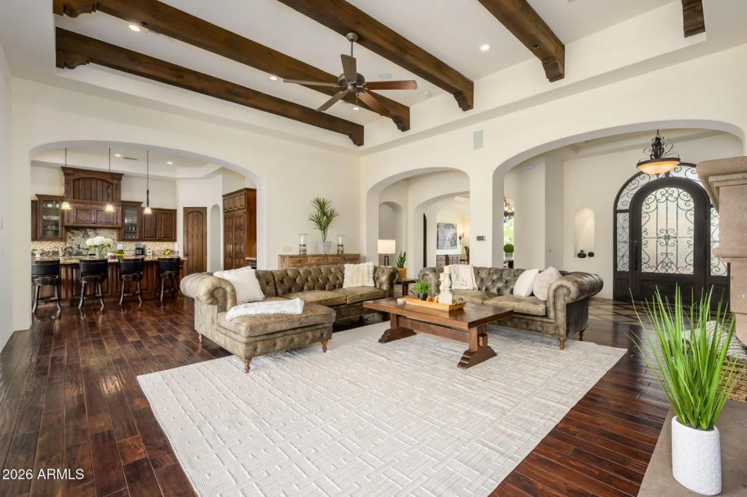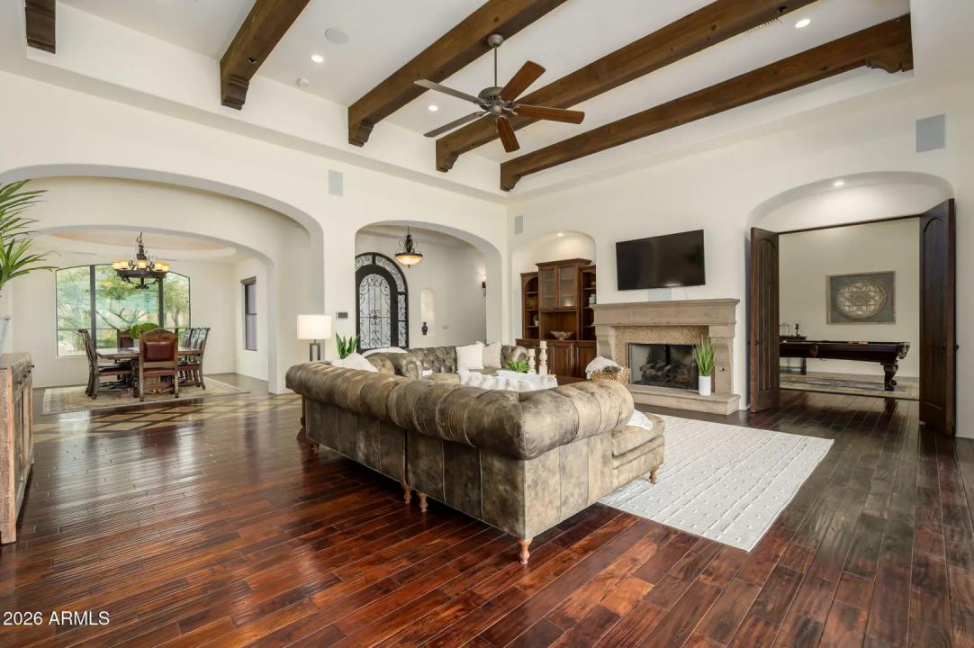 Experience refined desert living in this beautifully crafted residence set on an expansive lot within one of Scottsdale's premier gated enclaves. Hand-scraped acacia wood floors, wood-beam ceilings, and bespoke finishes create a warm, timeless backdrop throughout the home. The living room serves as the central gathering space, while the formal dining room is enhanced by a temperature-controlled wine room. A spacious game room with wet bar adds versatility, and each of the five ensuite bedrooms features its own designer bathroom. The primary bedroom retreat offers true serenity with a cozy fireplace, inviting sitting area, spa-like bathroom, and a huge custom closet. Newer AC units provide for multi-zone comfort, complemented by a new tankless