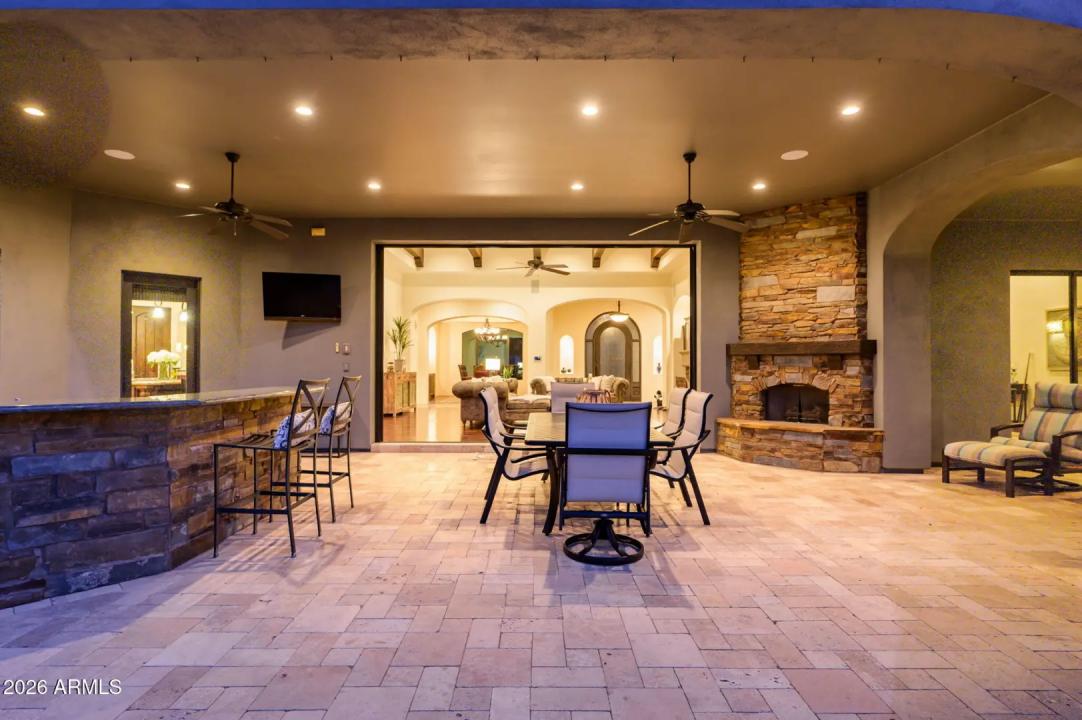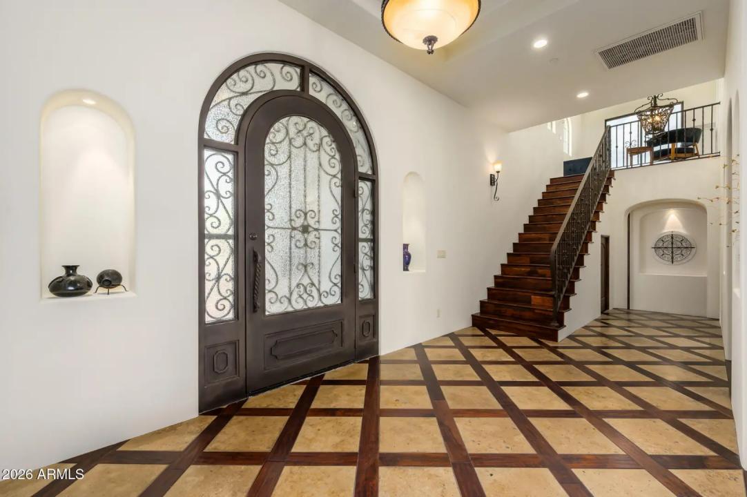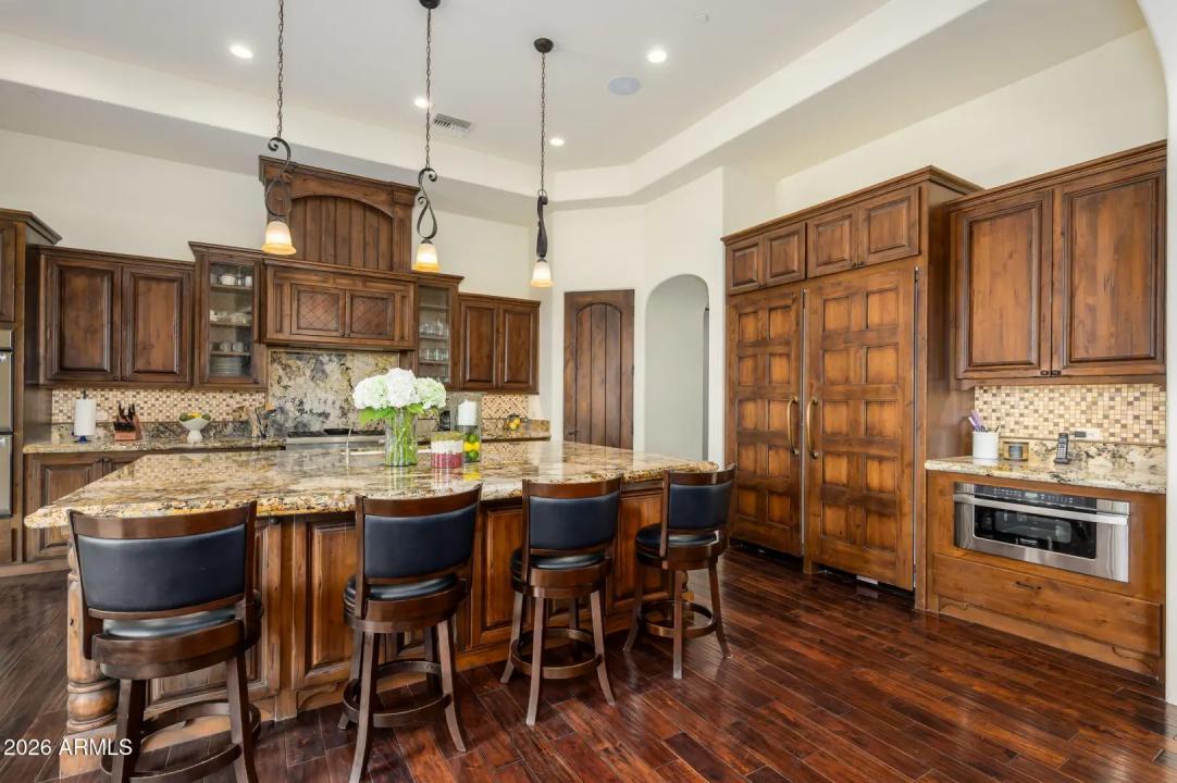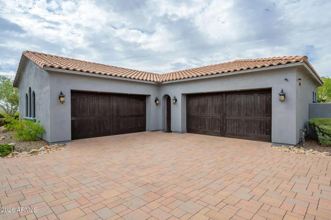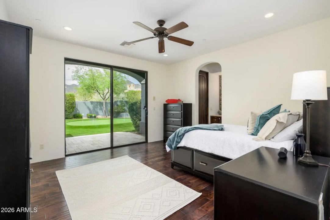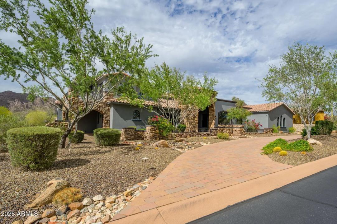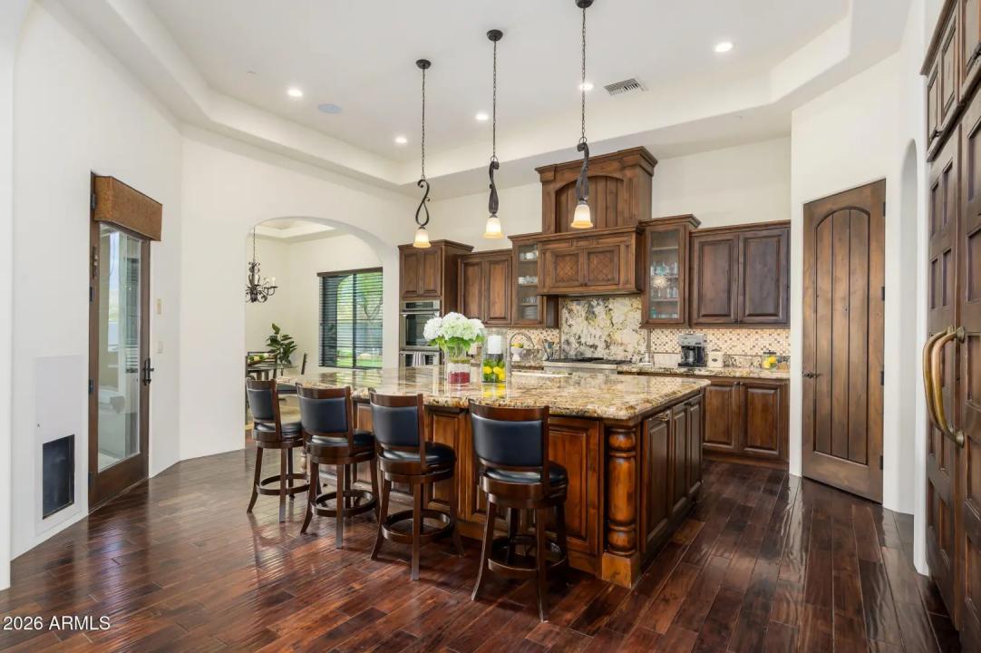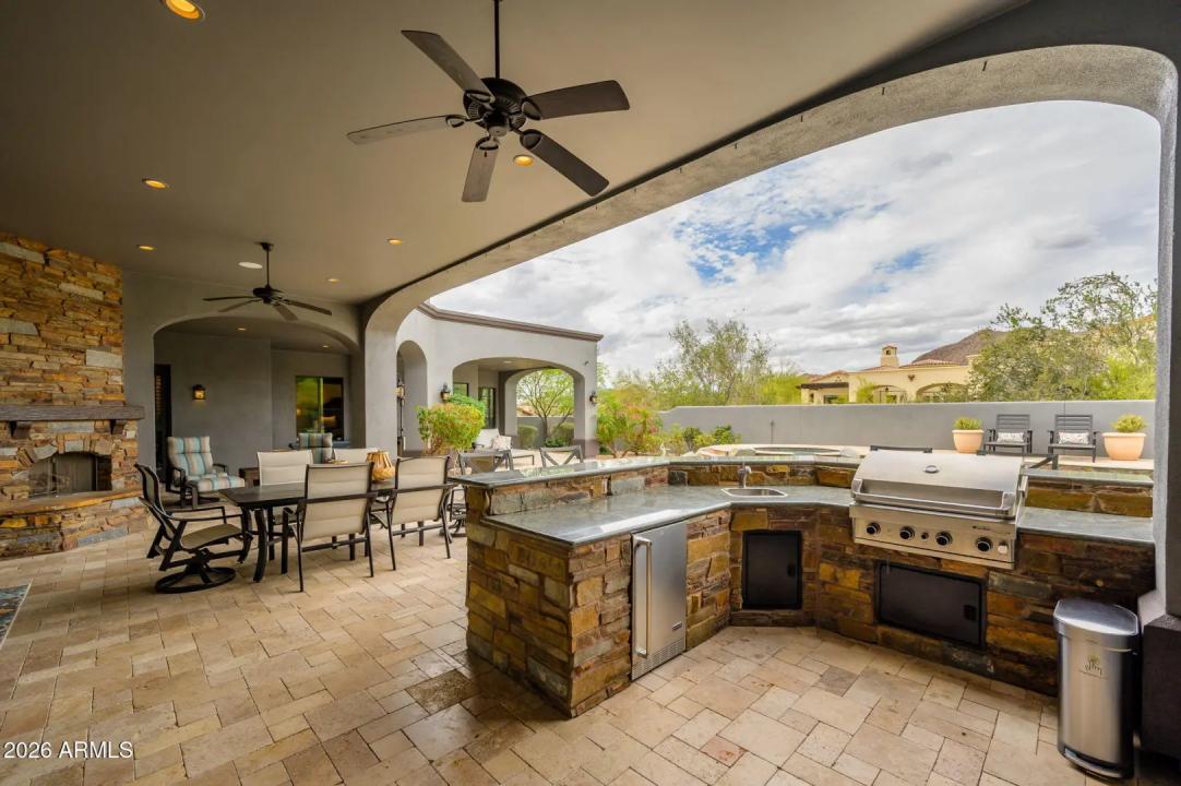 Experience refined desert living in this beautifully crafted residence set on an expansive lot within one of Scottsdale's premier gated enclaves. Hand-scraped acacia wood floors, wood-beam ceilings, and bespoke finishes create a warm, timeless backdrop throughout the home. The living room serves as the central gathering space, while the formal dining room is enhanced by a temperature-controlled wine room. A spacious game room with wet bar adds versatility, and each of the five ensuite bedrooms features its own designer bathroom. The primary bedroom retreat offers true serenity with a cozy fireplace, inviting sitting area, spa-like bathroom, and a huge custom closet. Newer AC units provide for multi-zone comfort, complemented by a new tankless