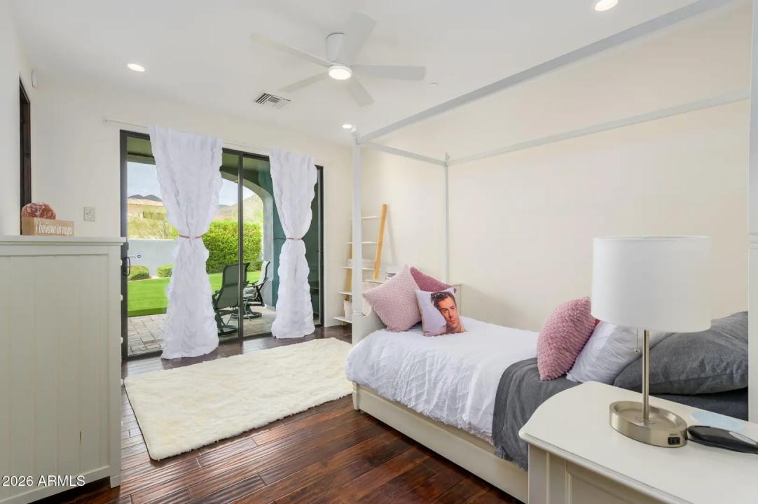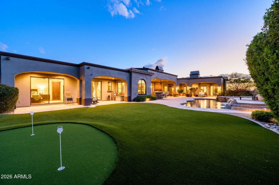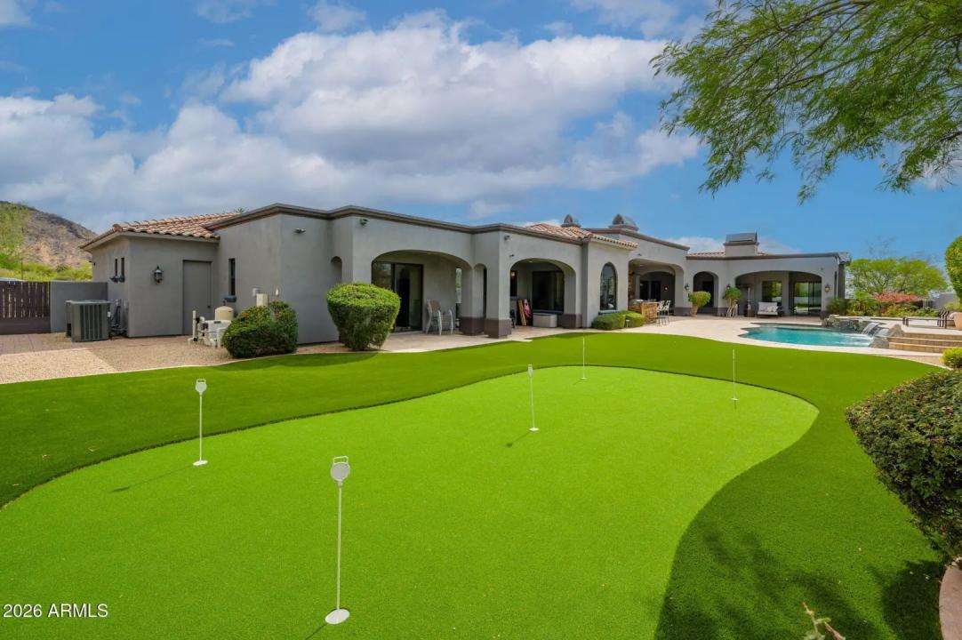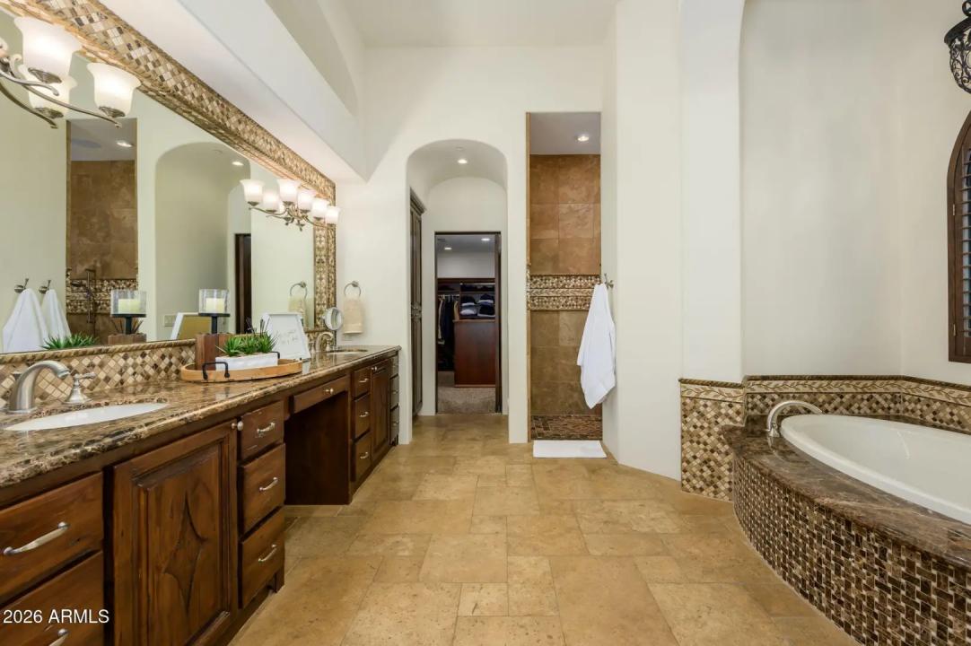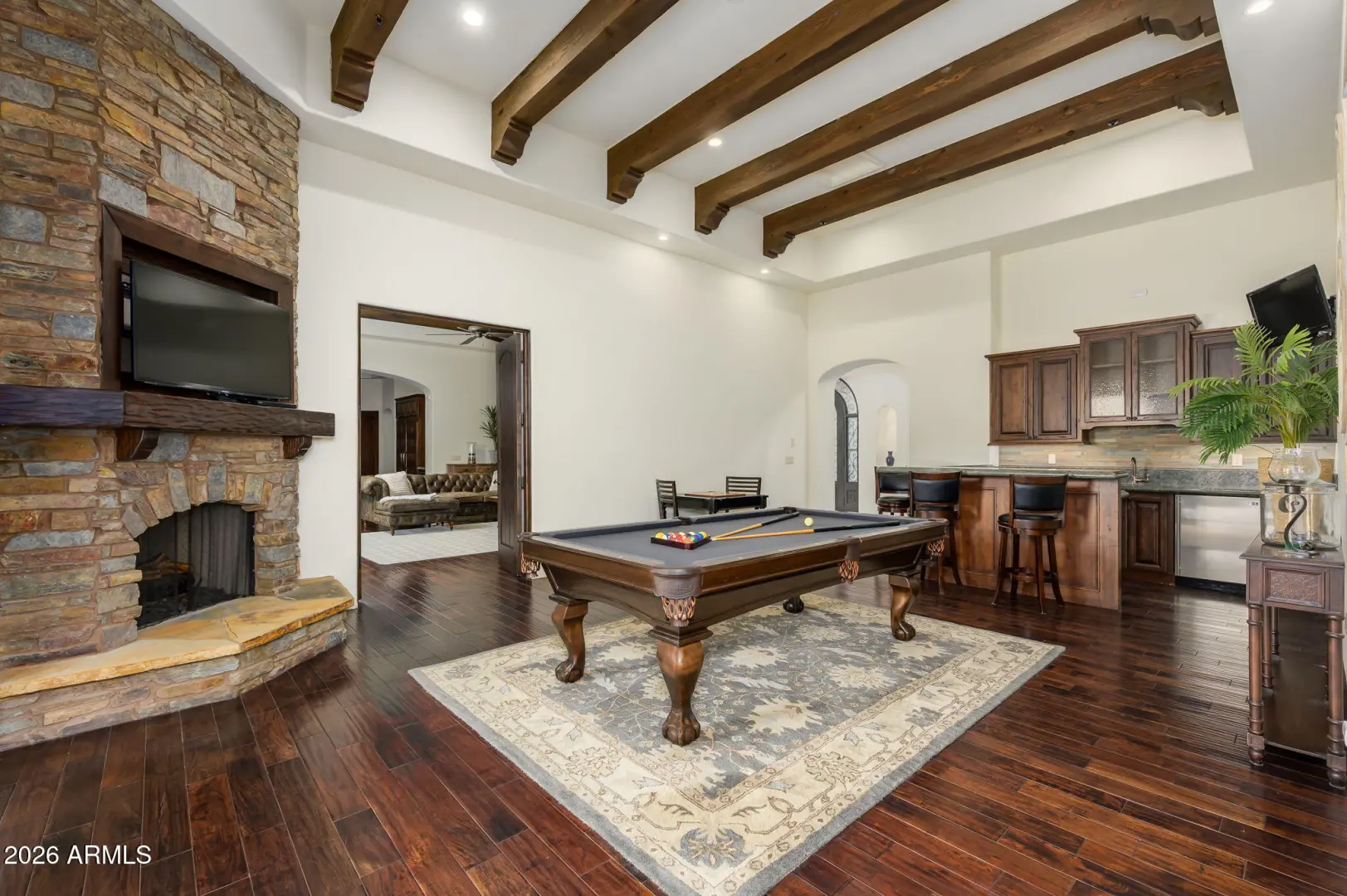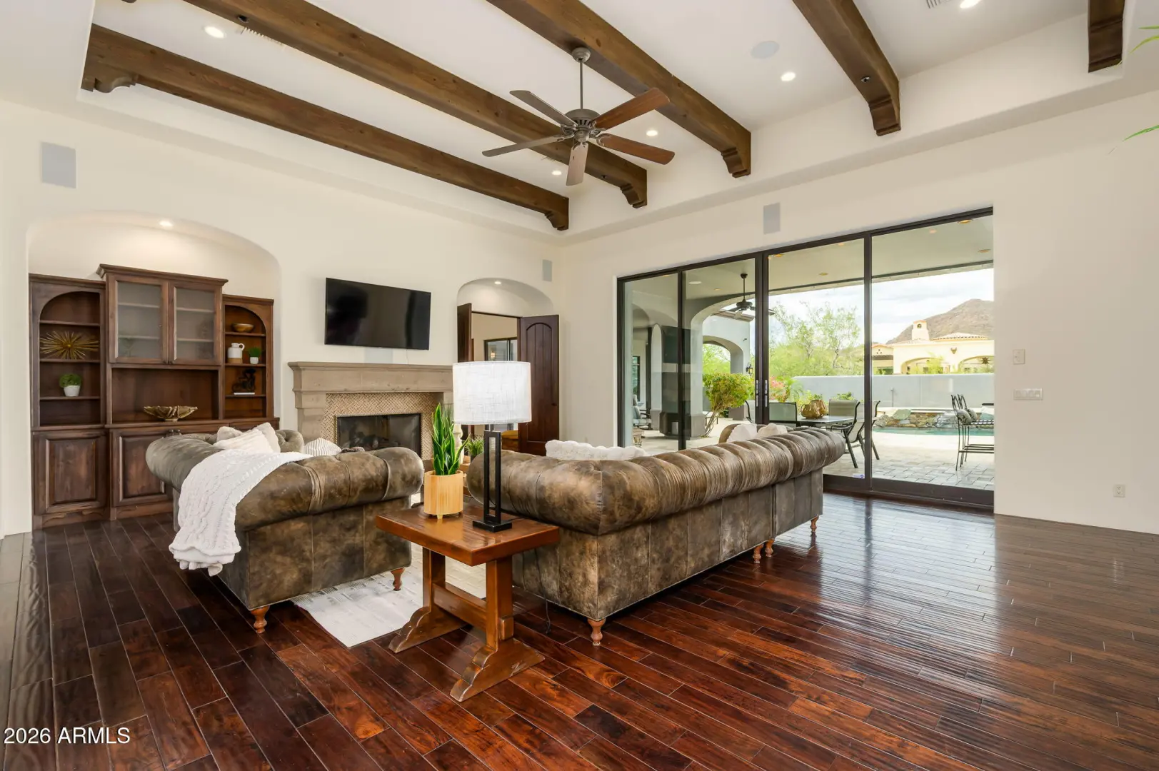 Experience refined desert living in this beautifully crafted residence set on an expansive lot within one of Scottsdale's premier gated enclaves. Hand-scraped acacia wood floors, wood-beam ceilings, and bespoke finishes create a warm, timeless backdrop throughout the home. The living room serves as the central gathering space, while the formal dining room is enhanced by a temperature-controlled wine room. A spacious game room with wet bar adds versatility, and each of the five ensuite bedrooms features its own designer bathroom. The primary bedroom retreat offers true serenity with a cozy fireplace, inviting sitting area, spa-like bathroom, and a huge custom closet. Newer AC units provide for multi-zone comfort, complemented by a new tankless