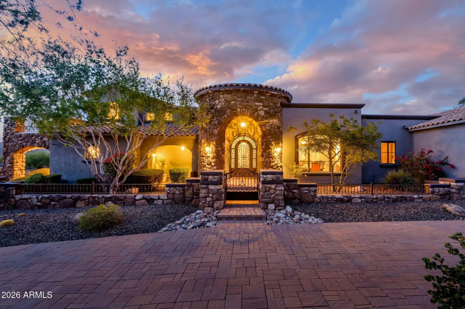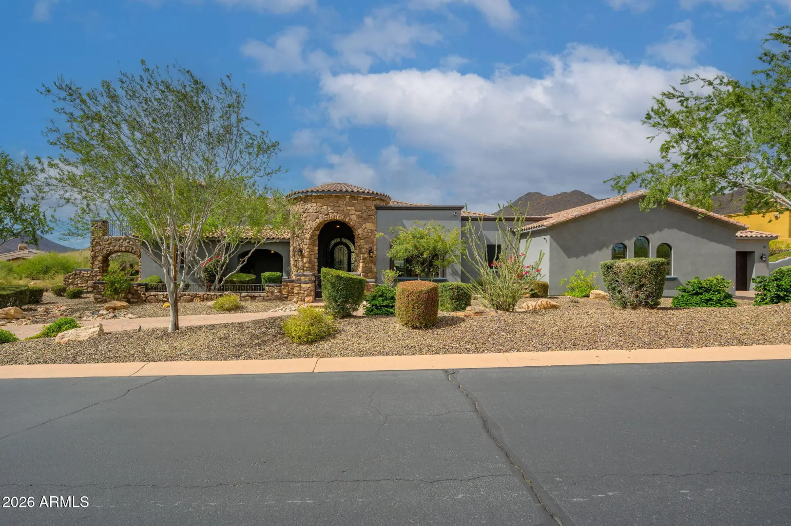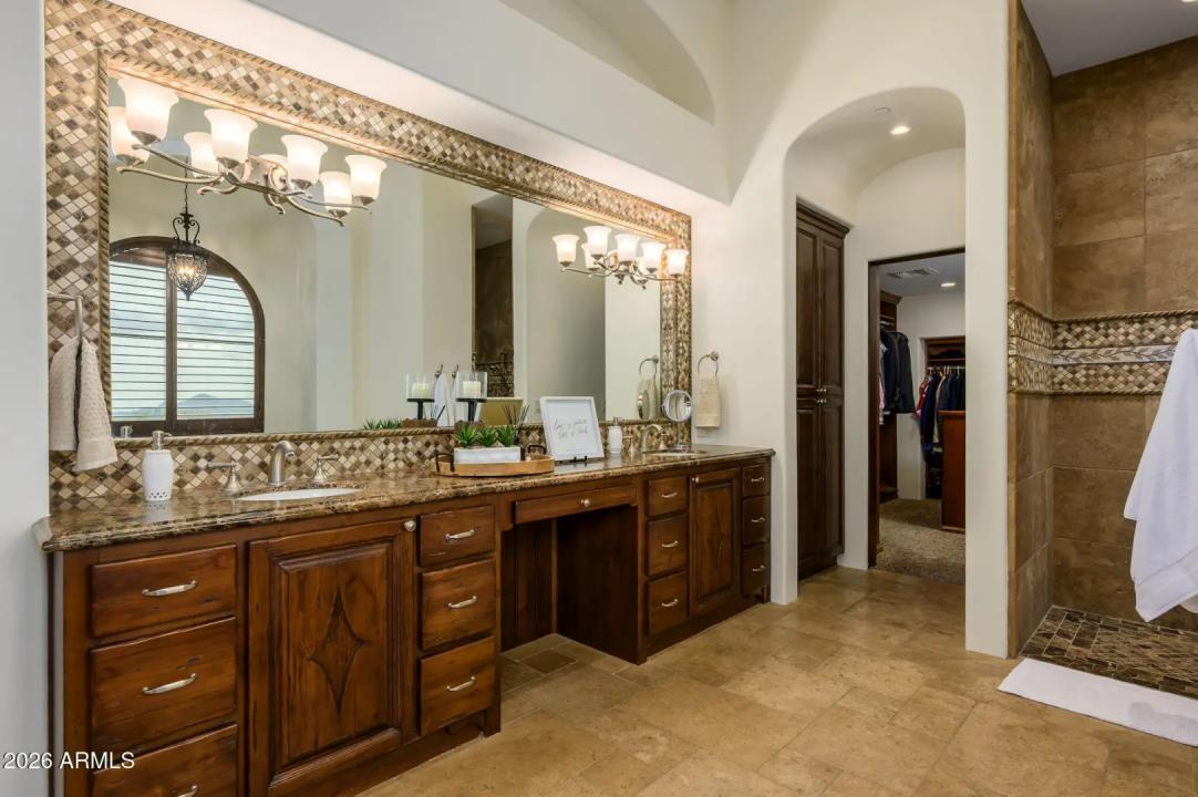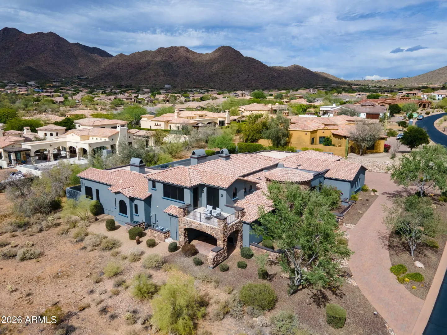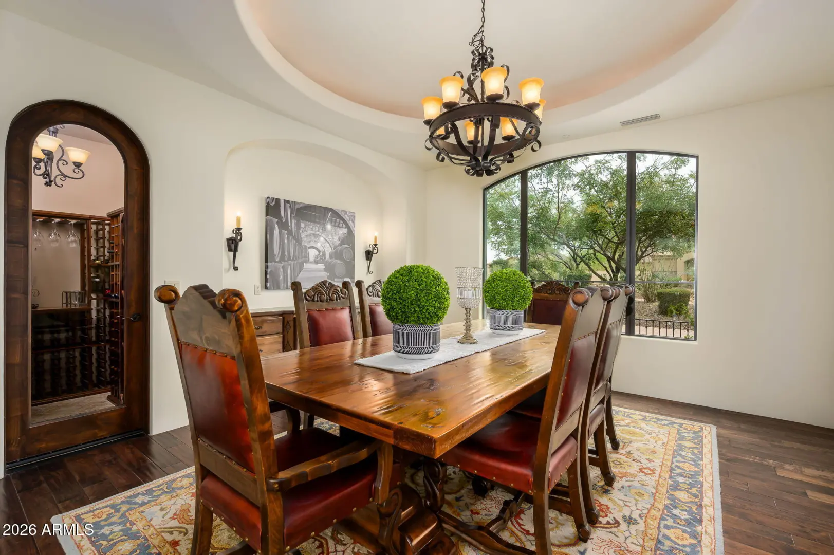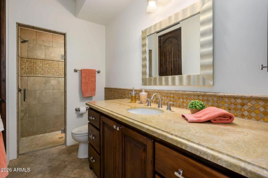 Experience refined desert living in this beautifully crafted residence set on an expansive lot within one of Scottsdale's premier gated enclaves. Hand-scraped acacia wood floors, wood-beam ceilings, and bespoke finishes create a warm, timeless backdrop throughout the home. The living room serves as the central gathering space, while the formal dining room is enhanced by a temperature-controlled wine room. A spacious game room with wet bar adds versatility, and each of the five ensuite bedrooms features its own designer bathroom. The primary bedroom retreat offers true serenity with a cozy fireplace, inviting sitting area, spa-like bathroom, and a huge custom closet. Newer AC units provide for multi-zone comfort, complemented by a new tankless