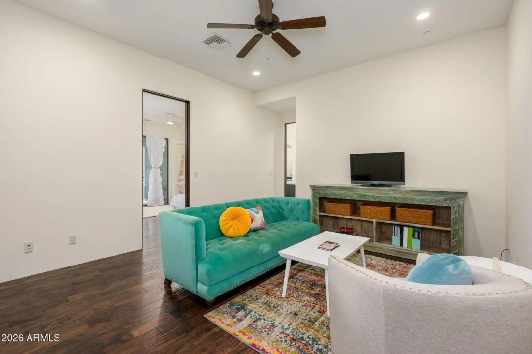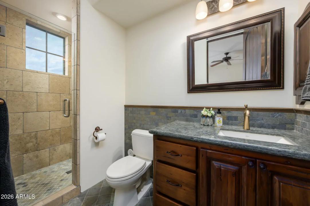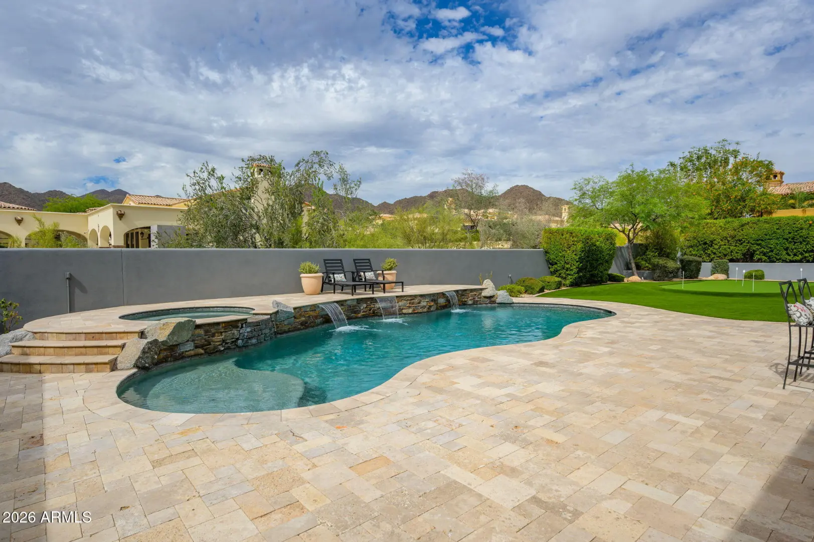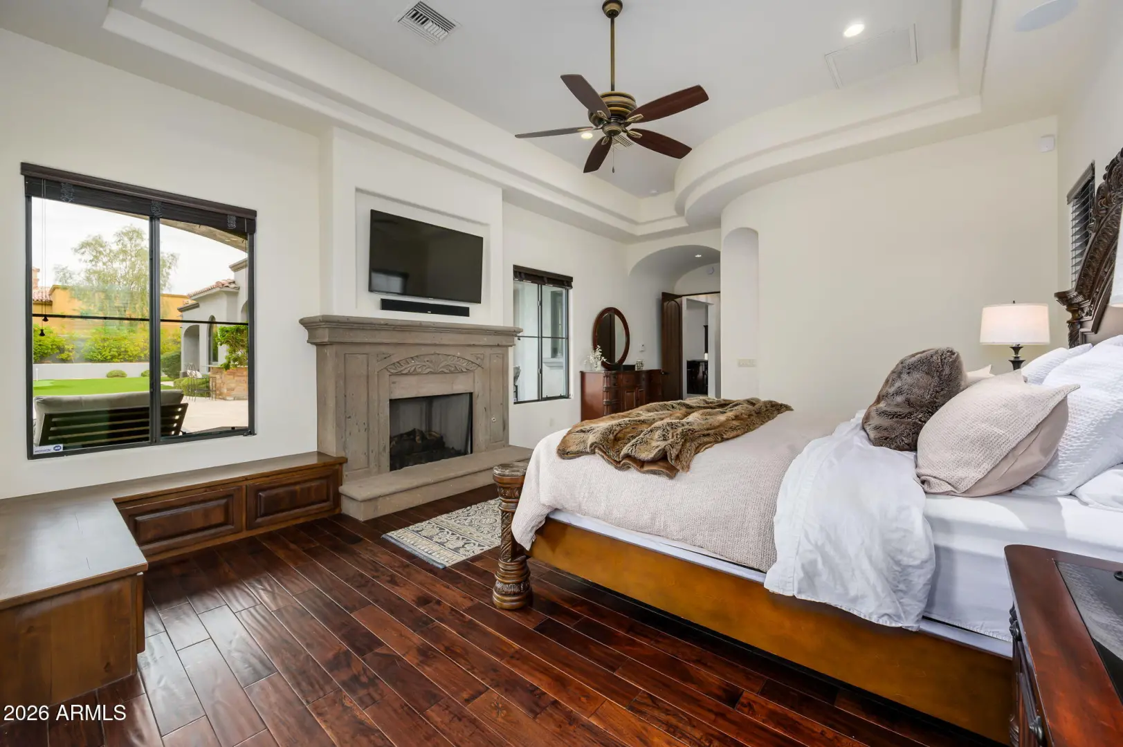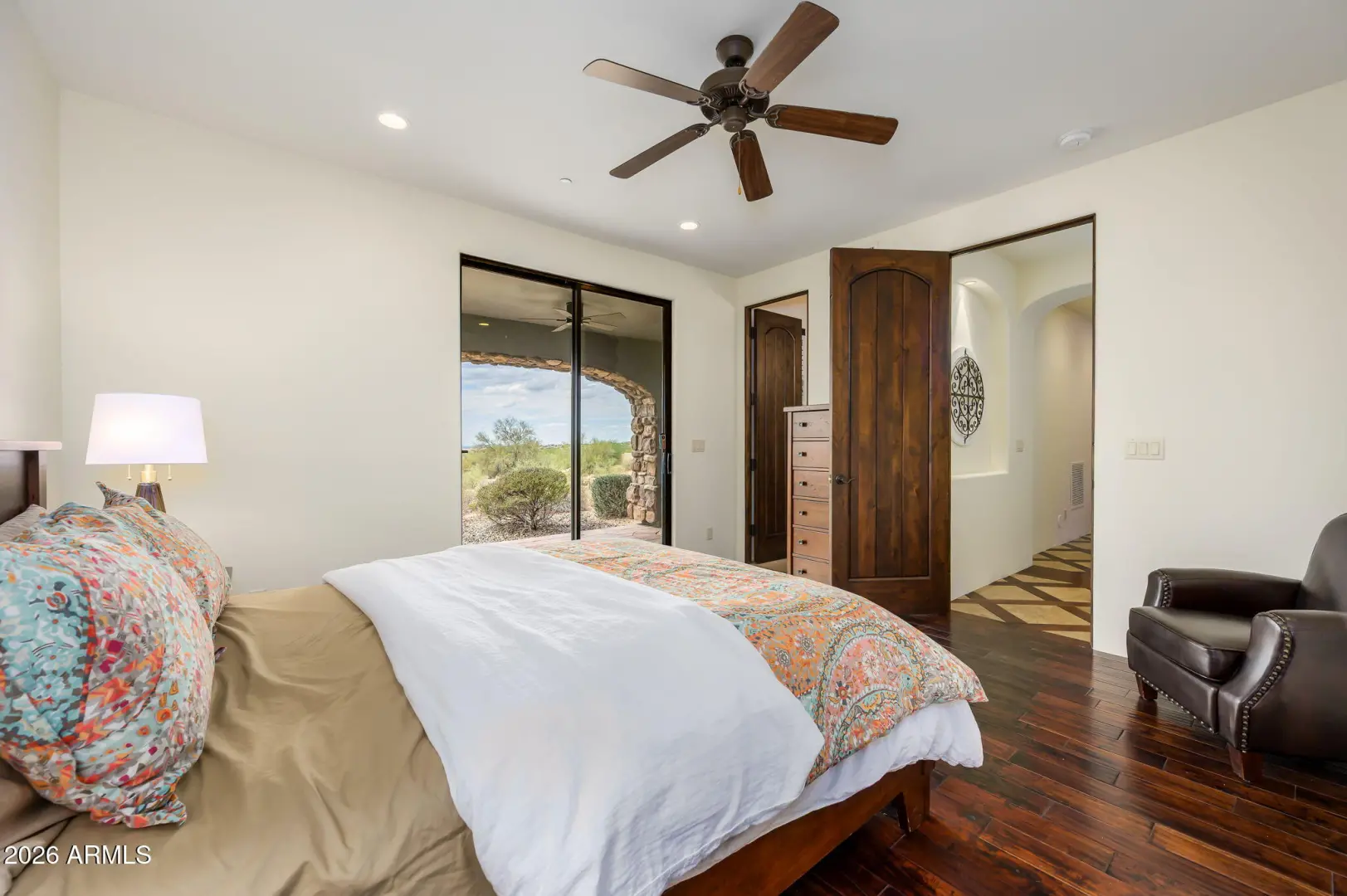 Experience refined desert living in this beautifully crafted residence set on an expansive lot within one of Scottsdale's premier gated enclaves. Hand-scraped acacia wood floors, wood-beam ceilings, and bespoke finishes create a warm, timeless backdrop throughout the home. The living room serves as the central gathering space, while the formal dining room is enhanced by a temperature-controlled wine room. A spacious game room with wet bar adds versatility, and each of the five ensuite bedrooms features its own designer bathroom. The primary bedroom retreat offers true serenity with a cozy fireplace, inviting sitting area, spa-like bathroom, and a huge custom closet. Newer AC units provide for multi-zone comfort, complemented by a new tankless
