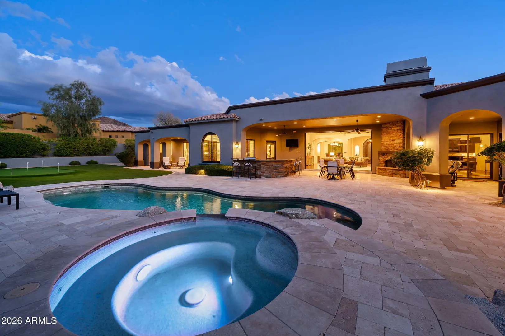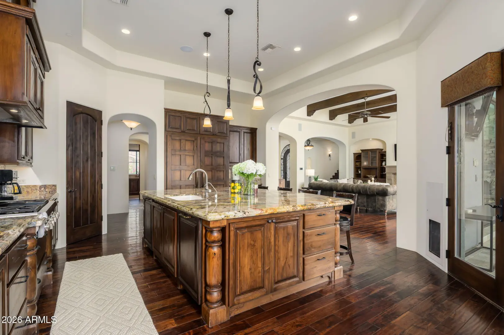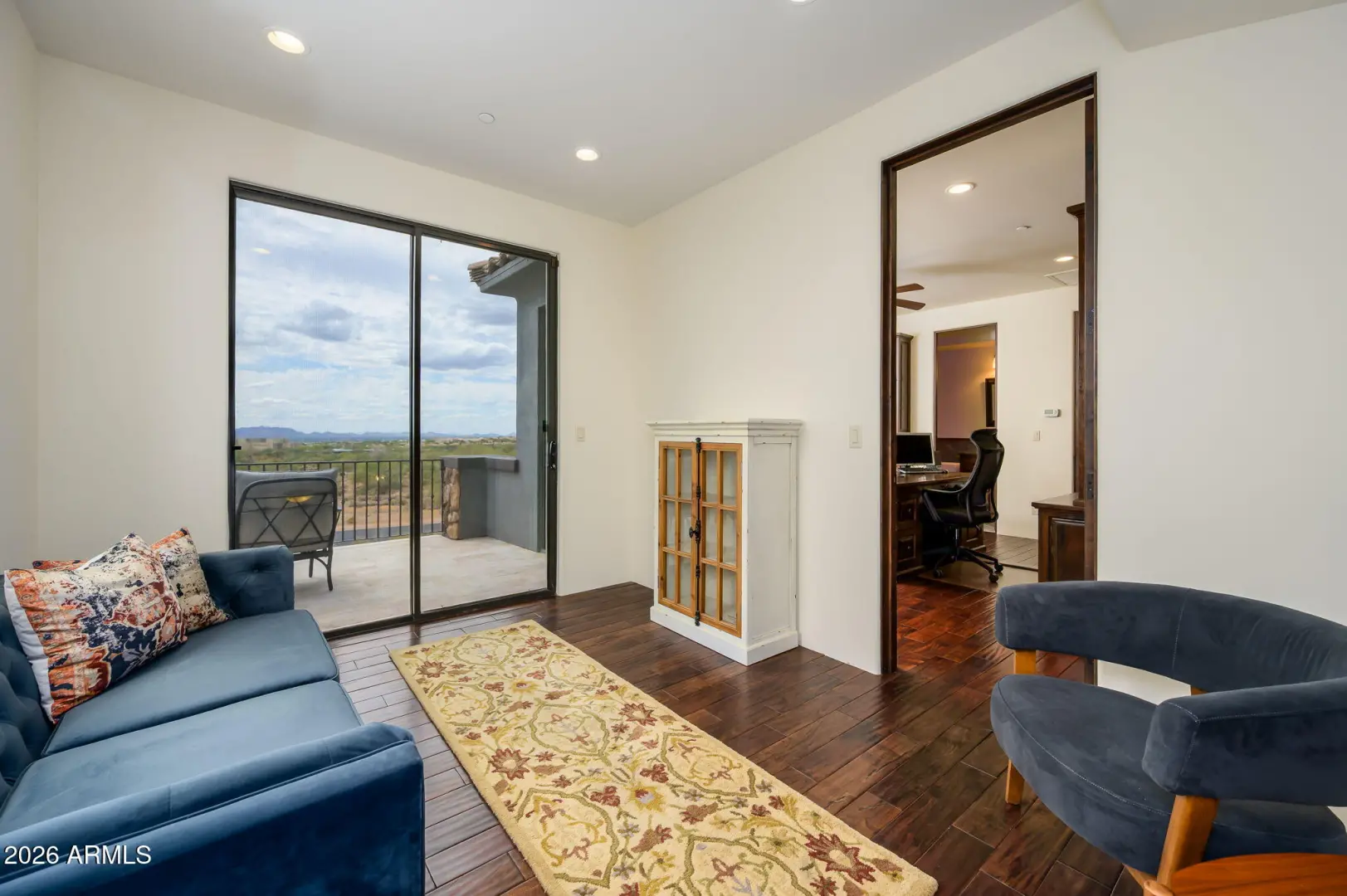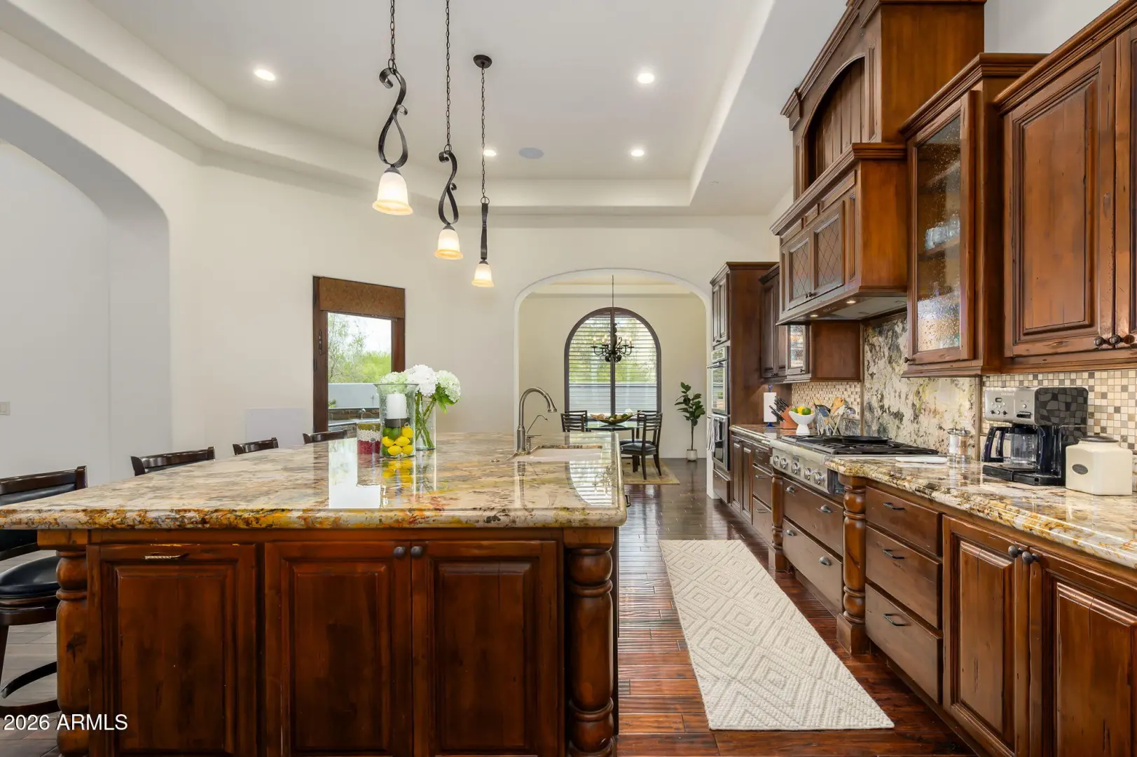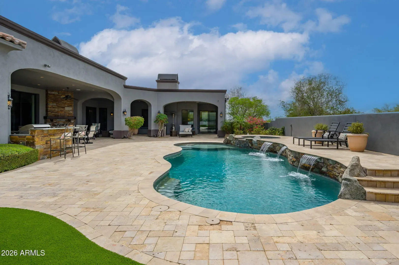Experience refined desert living in this beautifully crafted residence set on an expansive lot within one of Scottsdale's premier gated enclaves. Hand-scraped acacia wood floors, wood-beam ceilings, and bespoke finishes create a warm, timeless backdrop throughout the home. The living room serves as the central gathering space, while the formal dining room is enhanced by a temperature-controlled wine room. A spacious game room with wet bar adds versatility, and each of the five ensuite bedrooms features its own designer bathroom. The primary bedroom retreat offers true serenity with a cozy fireplace, inviting sitting area, spa-like bathroom, and a huge custom closet. Newer AC units provide for multi-zone comfort, complemented by a new tankless