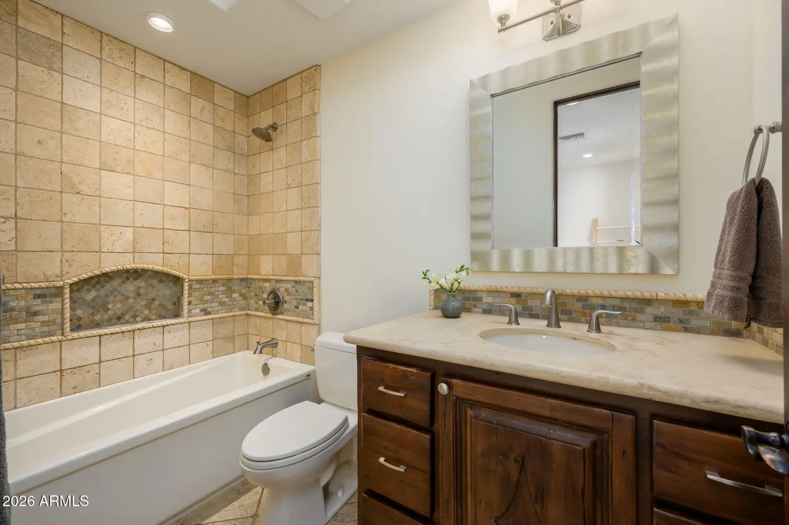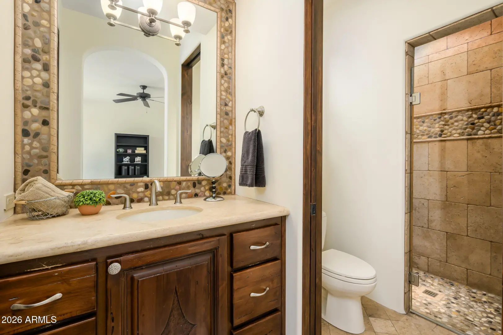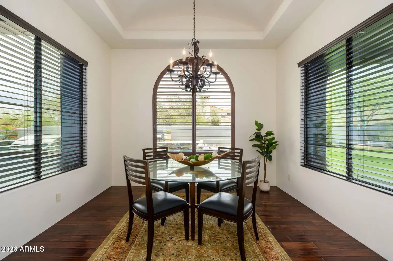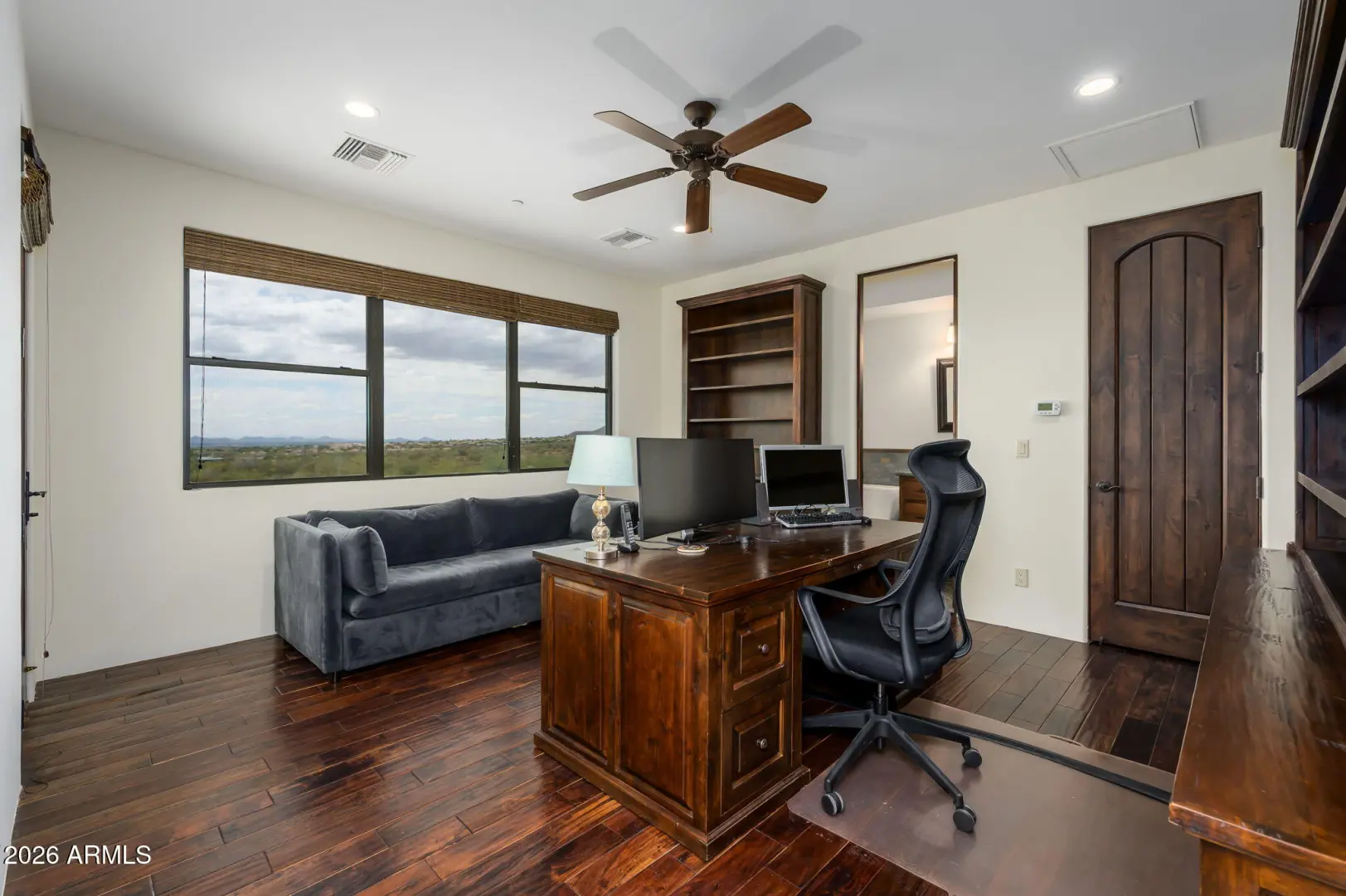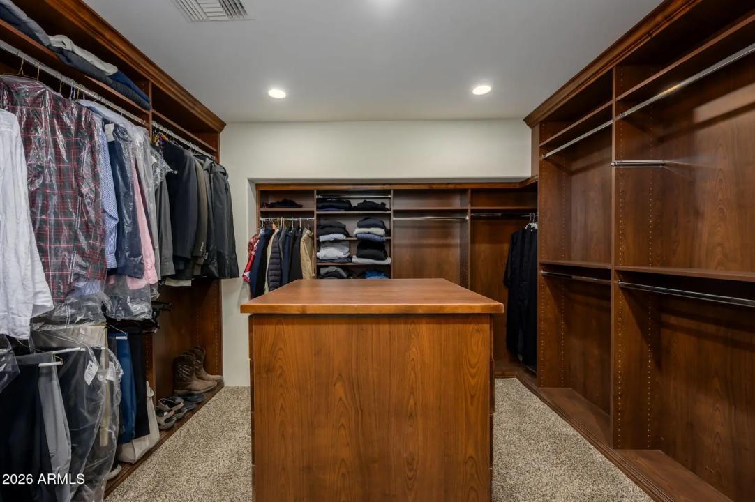 Experience refined desert living in this beautifully crafted residence set on an expansive lot within one of Scottsdale's premier gated enclaves. Hand-scraped acacia wood floors, wood-beam ceilings, and bespoke finishes create a warm, timeless backdrop throughout the home. The living room serves as the central gathering space, while the formal dining room is enhanced by a temperature-controlled wine room. A spacious game room with wet bar adds versatility, and each of the five ensuite bedrooms features its own designer bathroom. The primary bedroom retreat offers true serenity with a cozy fireplace, inviting sitting area, spa-like bathroom, and a huge custom closet. Newer AC units provide for multi-zone comfort, complemented by a new tankless
