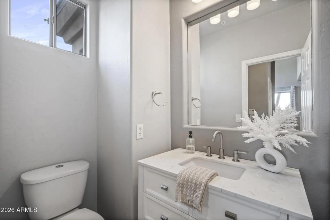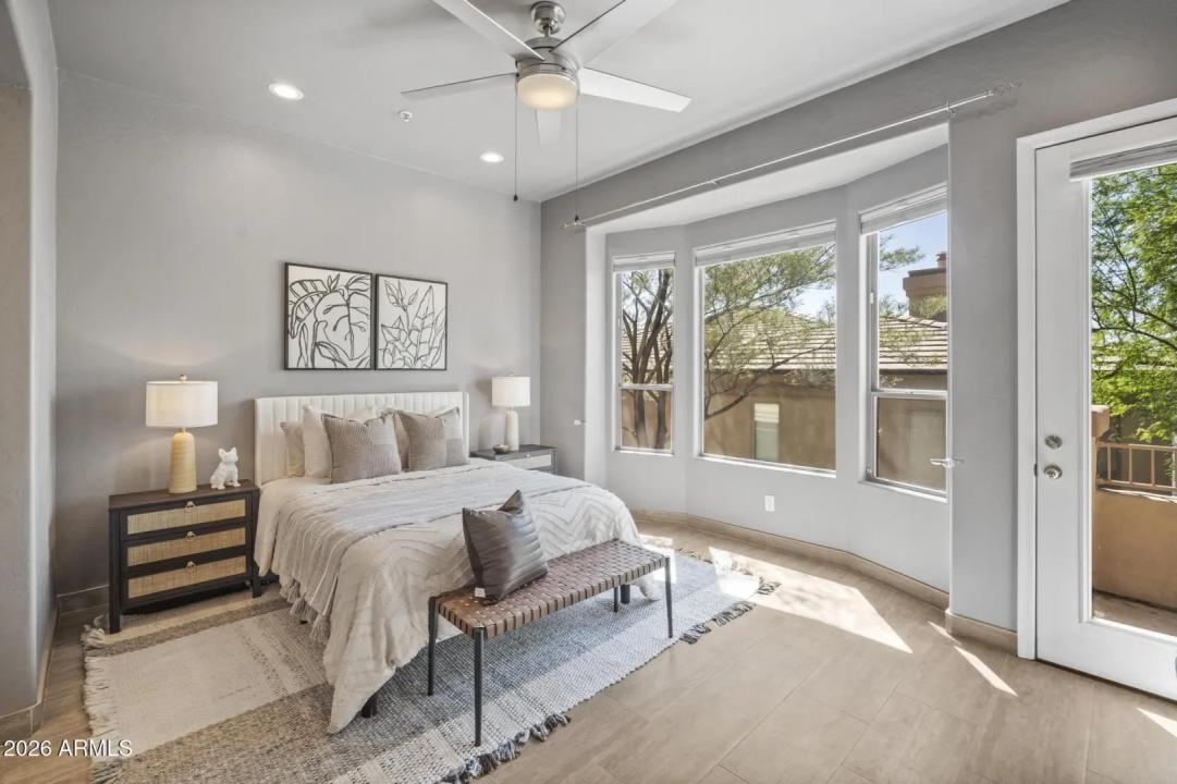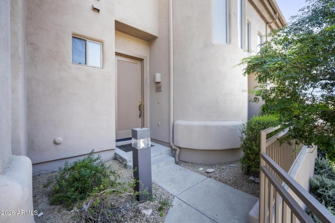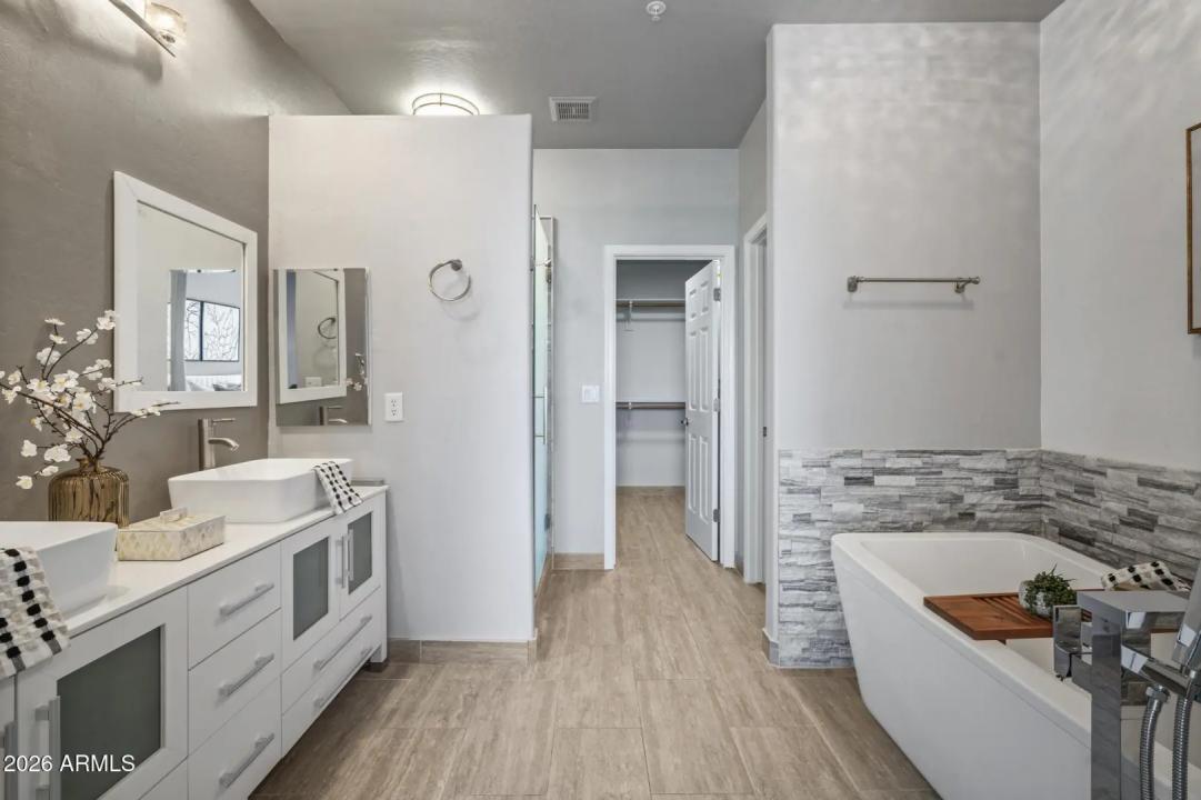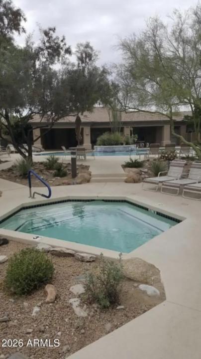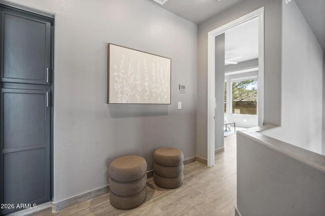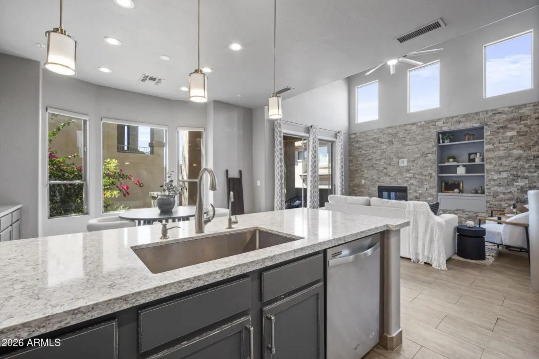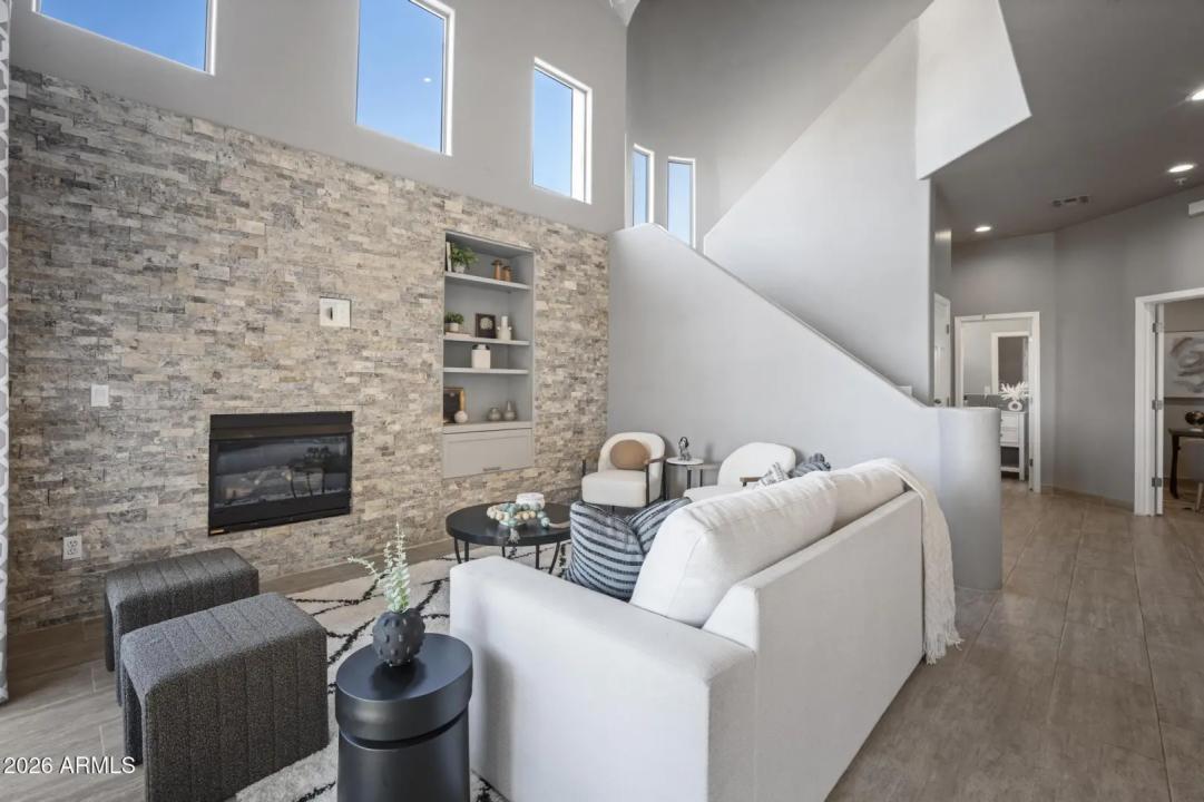 Resort living in the highly desirable gated community of Cachet at McDowell Mountain Ranch! This fully renovated townhome features soaring ceilings, abundant natural light & an open floorplan with wood-look tile throughout. The living room showcases a stacked stone gas fireplace & recessed lighting with designer finishes at every turn. Chef's kitchen offers custom gray cabinetry with pull-outs, quartz counters, breakfast bar with drop lighting & SS appliances. Flex den/office is on the main level. Upstairs you'll find two spacious ensuite bedrooms with fully remodeled baths, modern vanities & raised sinks. The primary suite boasts a freestanding soaking tub, oversized shower with deco tile & big walk-in closet. This unit also includes an attached two car garage! Enjoy breathtaking McDowell