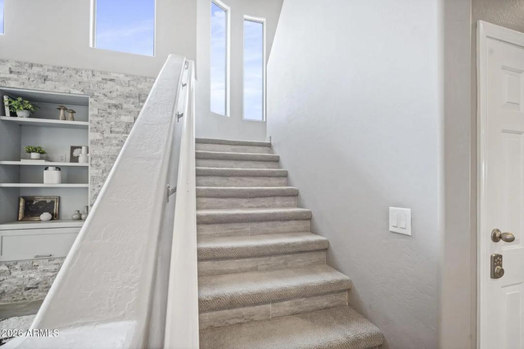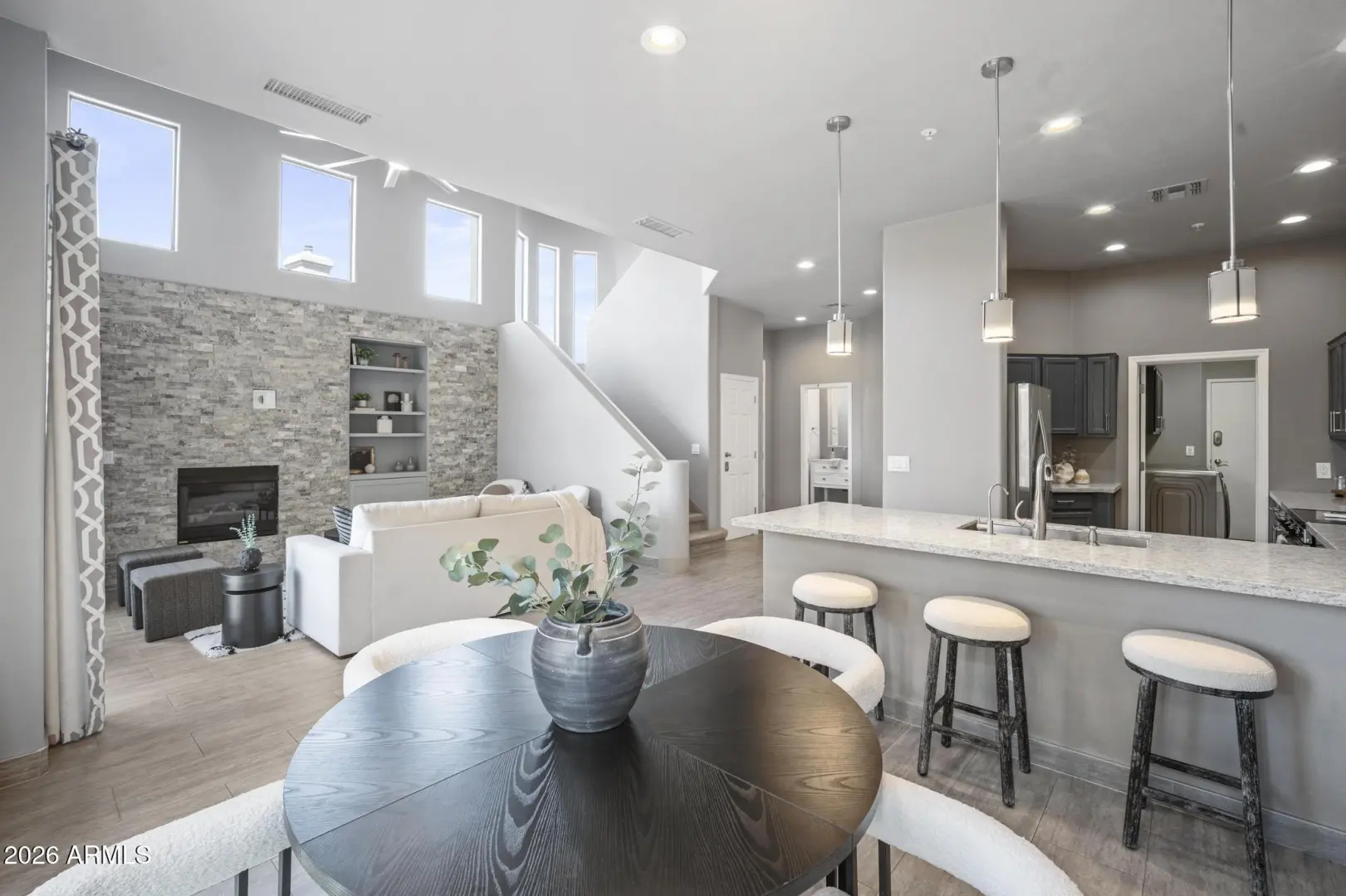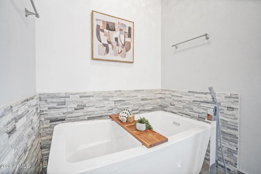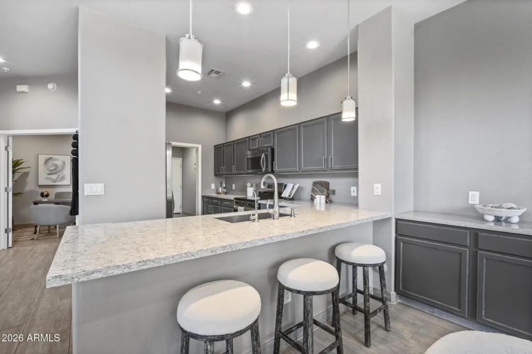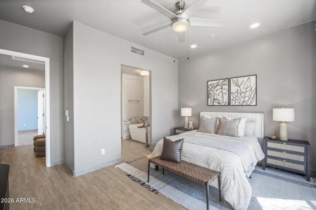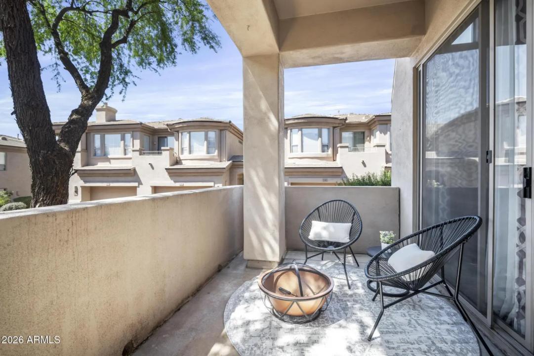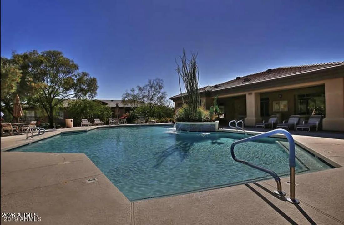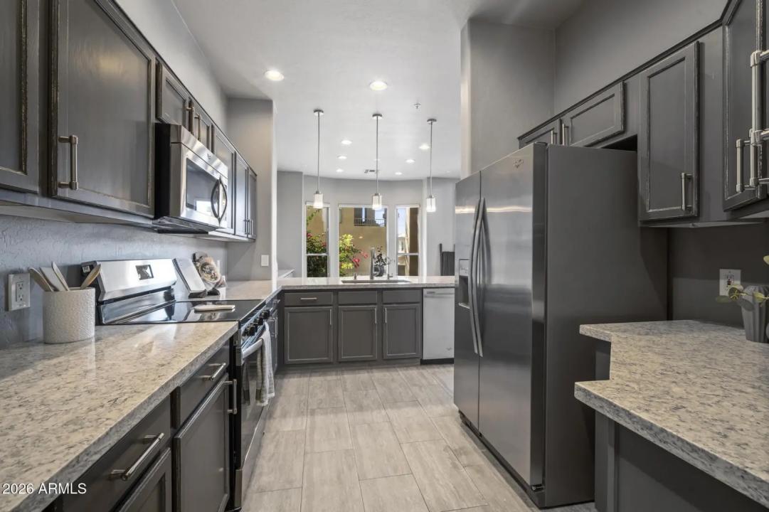 Resort living in the highly desirable gated community of Cachet at McDowell Mountain Ranch! This fully renovated townhome features soaring ceilings, abundant natural light & an open floorplan with wood-look tile throughout. The living room showcases a stacked stone gas fireplace & recessed lighting with designer finishes at every turn. Chef's kitchen offers custom gray cabinetry with pull-outs, quartz counters, breakfast bar with drop lighting & SS appliances. Flex den/office is on the main level. Upstairs you'll find two spacious ensuite bedrooms with fully remodeled baths, modern vanities & raised sinks. The primary suite boasts a freestanding soaking tub, oversized shower with deco tile & big walk-in closet. This unit also includes an attached two car garage! Enjoy breathtaking McDowell
