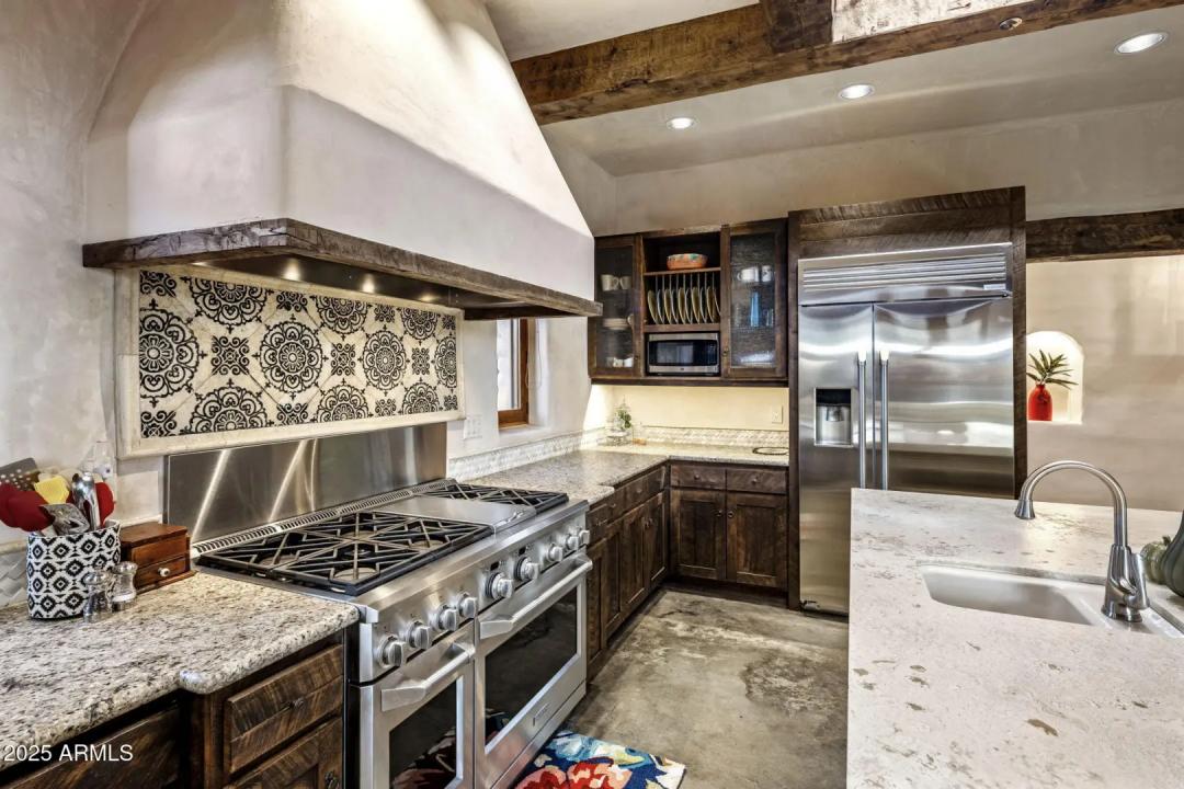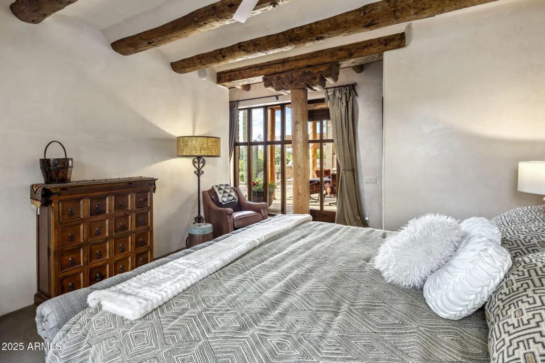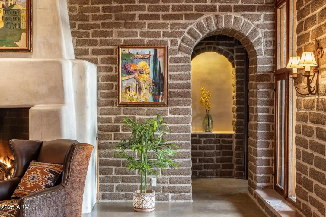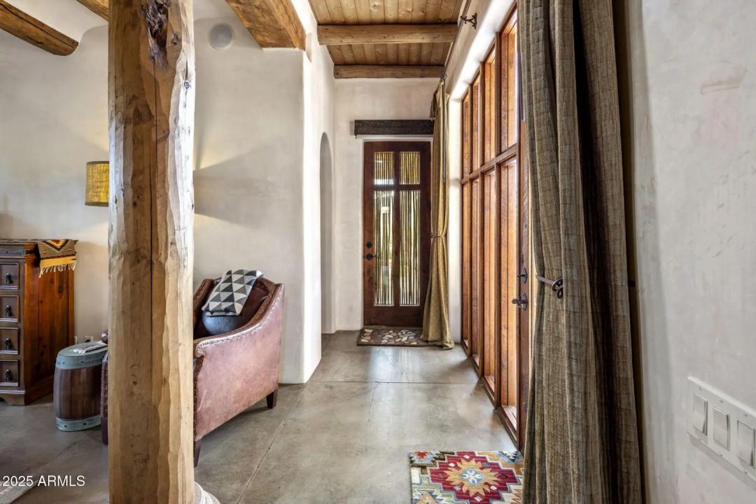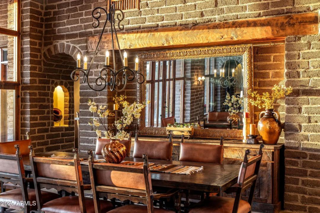 Authentic Southwest charm meets timeless luxury in this custom Tom Archer-built estate located in the exclusive guard-gated community of Sincuidados. Crafted with true Adobe brick construction, this home exudes character and quality throughout. Perfectly positioned on over an acre of privacy with quiet interior placement, it captures sweeping mountain views and breathtaking sunsets. Inside, rich architectural details abound, from tongue-and-groove ceilings with viga beams to hand-carved pilasters and corbels, Venetian-plastered walls, and antique doors. The thoughtfully designed floor plan features 3 bedrooms and 3.5 baths, highlighted by warm concrete floors, 3 interior gas fireplaces, and a chef's kitchen with honed granite countertops, quarter-sawn treatment cabinets, and stainless