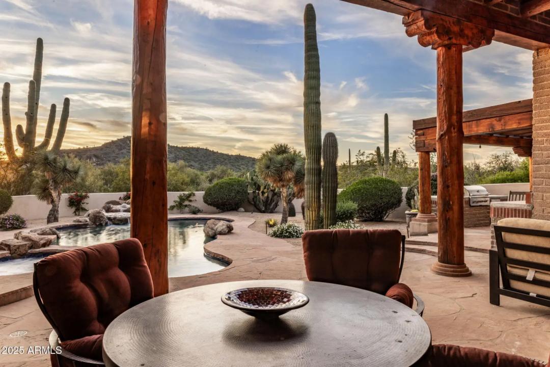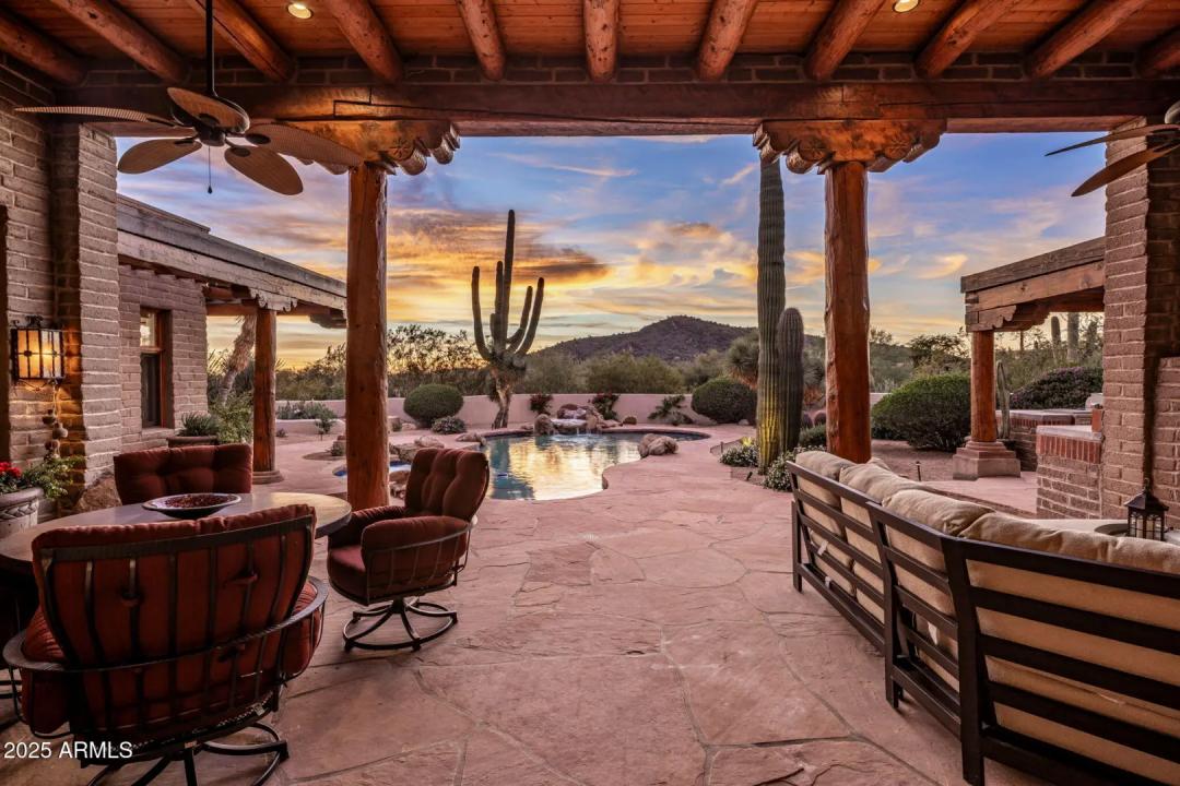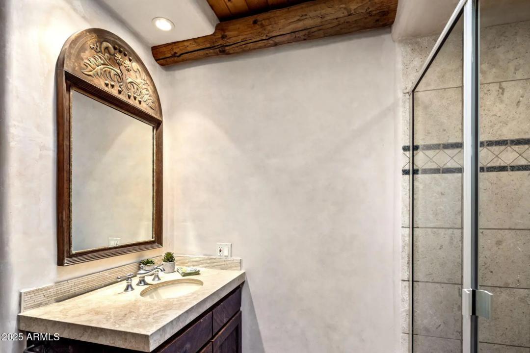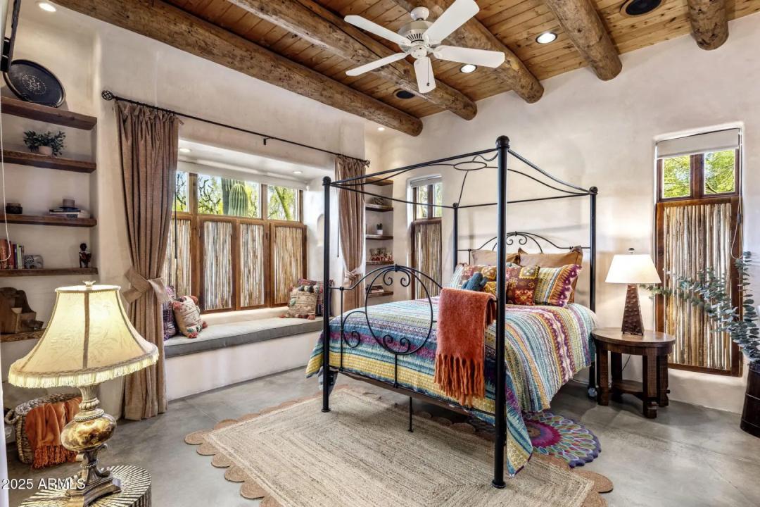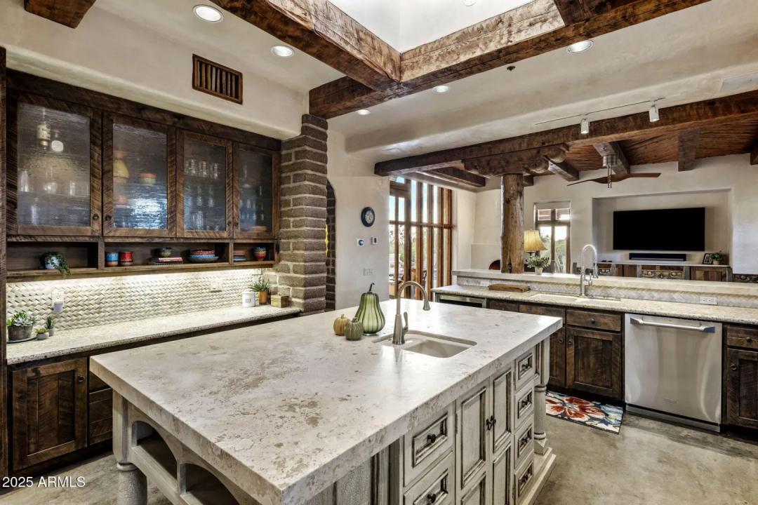 Authentic Southwest charm meets timeless luxury in this custom Tom Archer-built estate located in the exclusive guard-gated community of Sincuidados. Crafted with true Adobe brick construction, this home exudes character and quality throughout. Perfectly positioned on over an acre of privacy with quiet interior placement, it captures sweeping mountain views and breathtaking sunsets. Inside, rich architectural details abound, from tongue-and-groove ceilings with viga beams to hand-carved pilasters and corbels, Venetian-plastered walls, and antique doors. The thoughtfully designed floor plan features 3 bedrooms and 3.5 baths, highlighted by warm concrete floors, 3 interior gas fireplaces, and a chef's kitchen with honed granite countertops, quarter-sawn treatment cabinets, and stainless