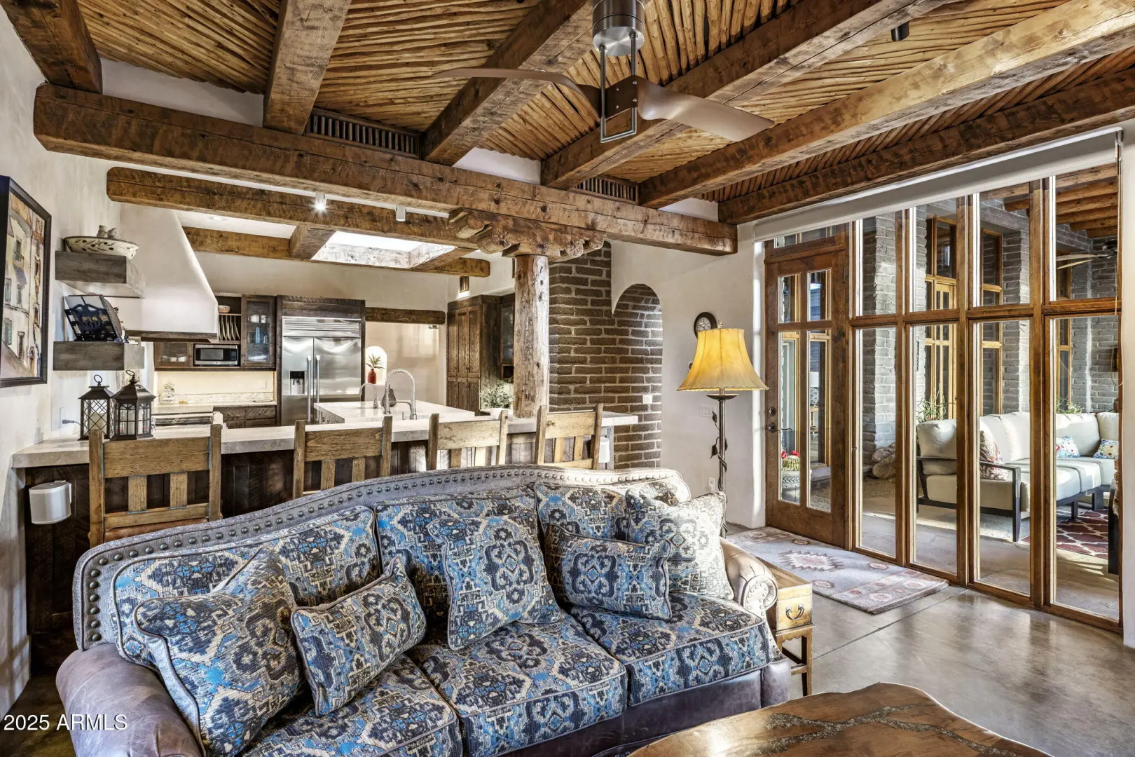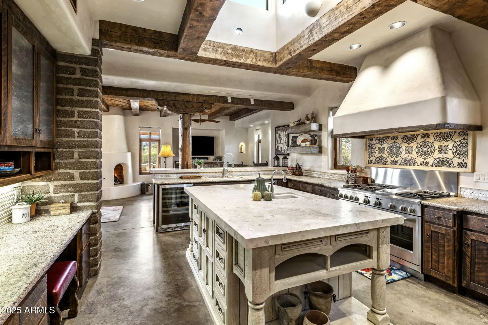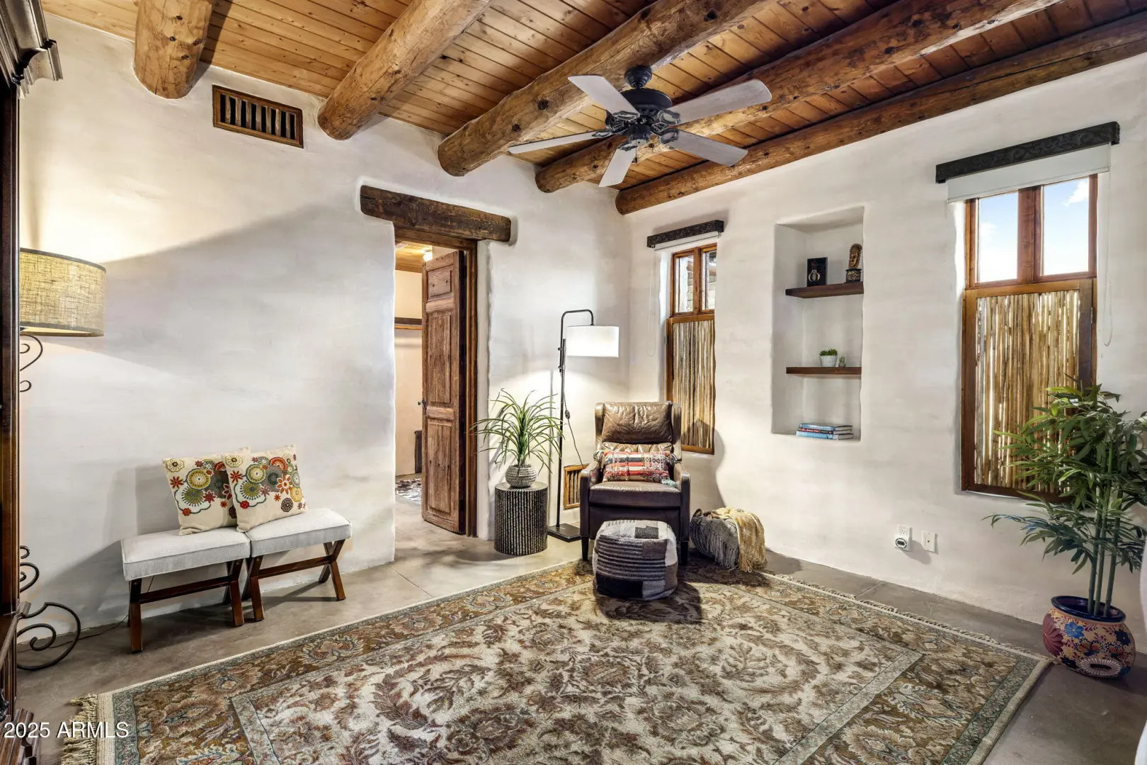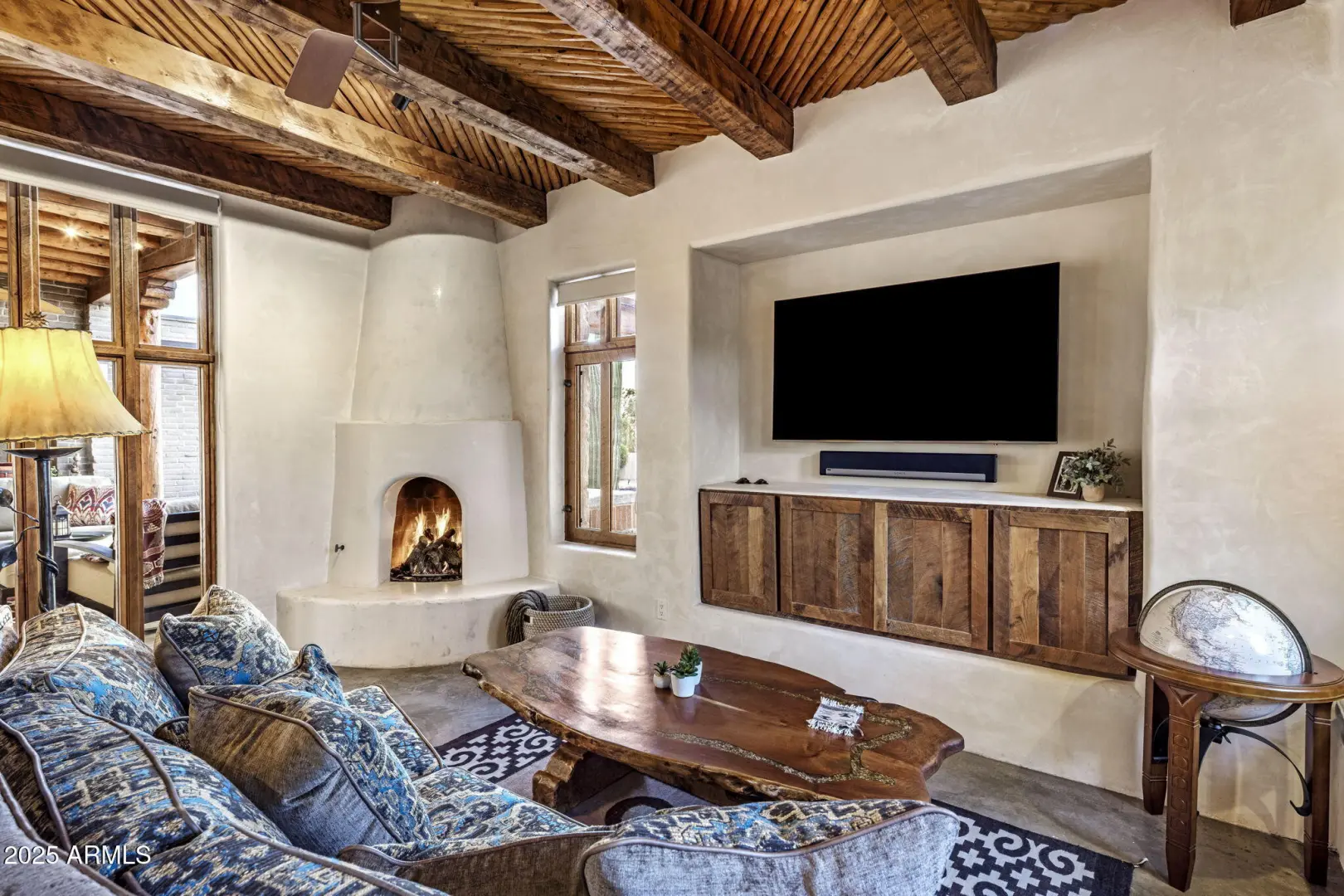 Authentic Southwest charm meets timeless luxury in this custom Tom Archer-built estate located in the exclusive guard-gated community of Sincuidados. Crafted with true Adobe brick construction, this home exudes character and quality throughout. Perfectly positioned on over an acre of privacy with quiet interior placement, it captures sweeping mountain views and breathtaking sunsets. Inside, rich architectural details abound, from tongue-and-groove ceilings with viga beams to hand-carved pilasters and corbels, Venetian-plastered walls, and antique doors. The thoughtfully designed floor plan features 3 bedrooms and 3.5 baths, highlighted by warm concrete floors, 3 interior gas fireplaces, and a chef's kitchen with honed granite countertops, quarter-sawn treatment cabinets, and stainless