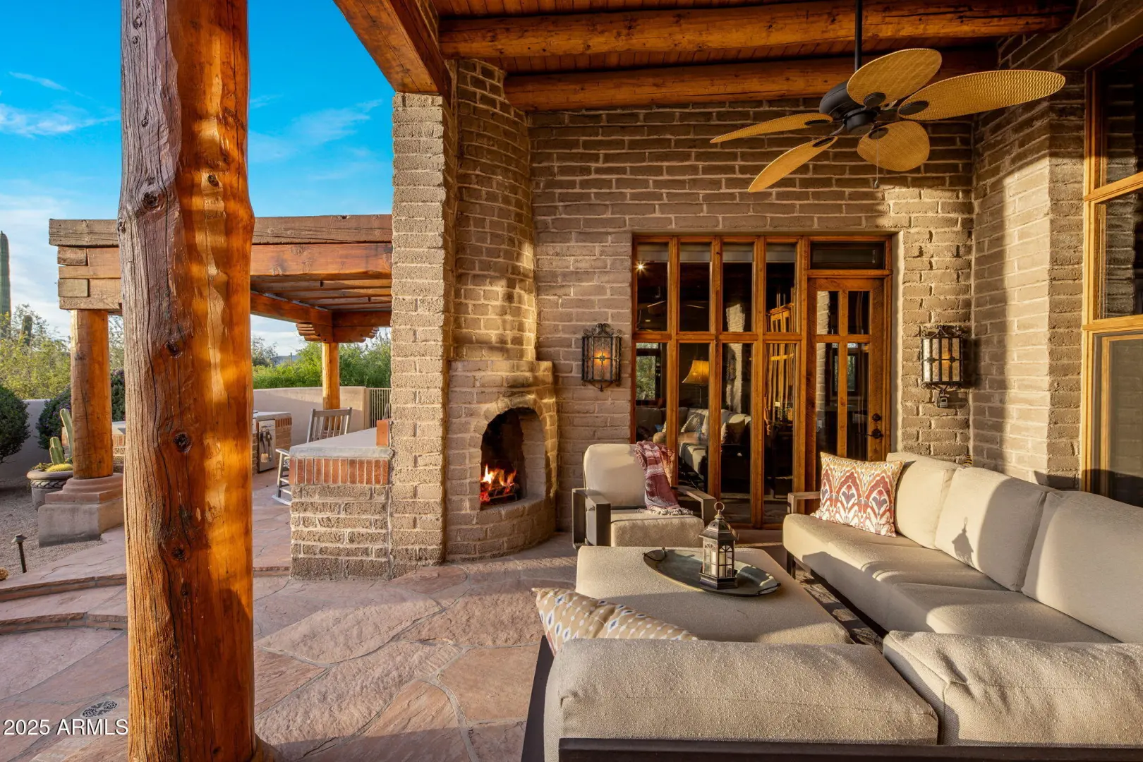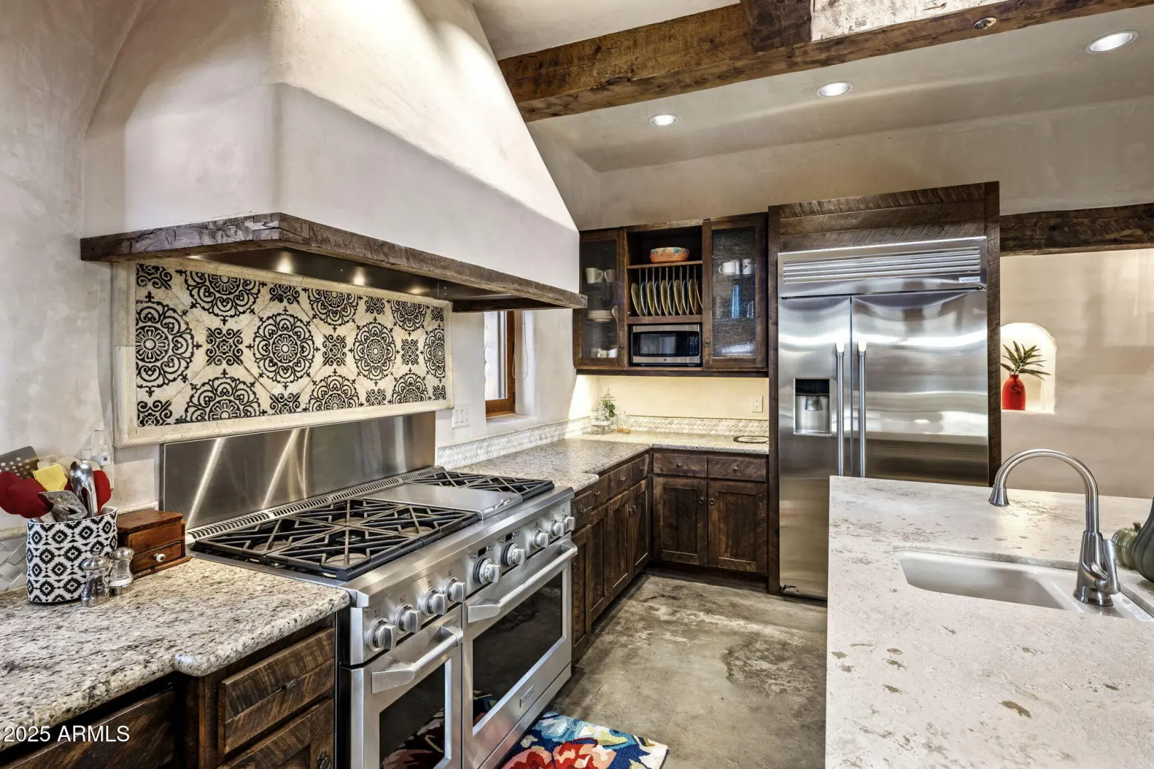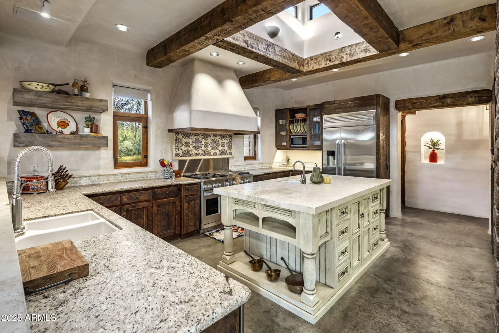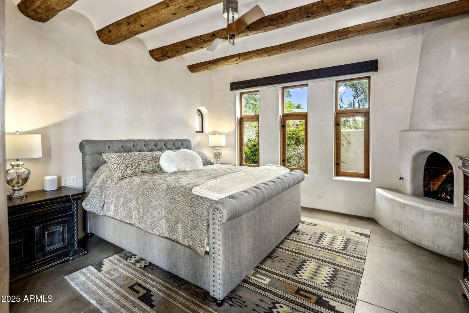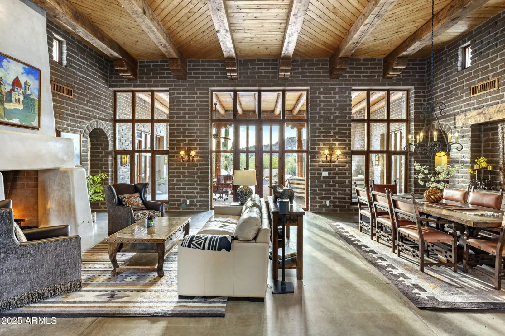 Authentic Southwest charm meets timeless luxury in this custom Tom Archer-built estate located in the exclusive guard-gated community of Sincuidados. Crafted with true Adobe brick construction, this home exudes character and quality throughout. Perfectly positioned on over an acre of privacy with quiet interior placement, it captures sweeping mountain views and breathtaking sunsets. Inside, rich architectural details abound, from tongue-and-groove ceilings with viga beams to hand-carved pilasters and corbels, Venetian-plastered walls, and antique doors. The thoughtfully designed floor plan features 3 bedrooms and 3.5 baths, highlighted by warm concrete floors, 3 interior gas fireplaces, and a chef's kitchen with honed granite countertops, quarter-sawn treatment cabinets, and stainless