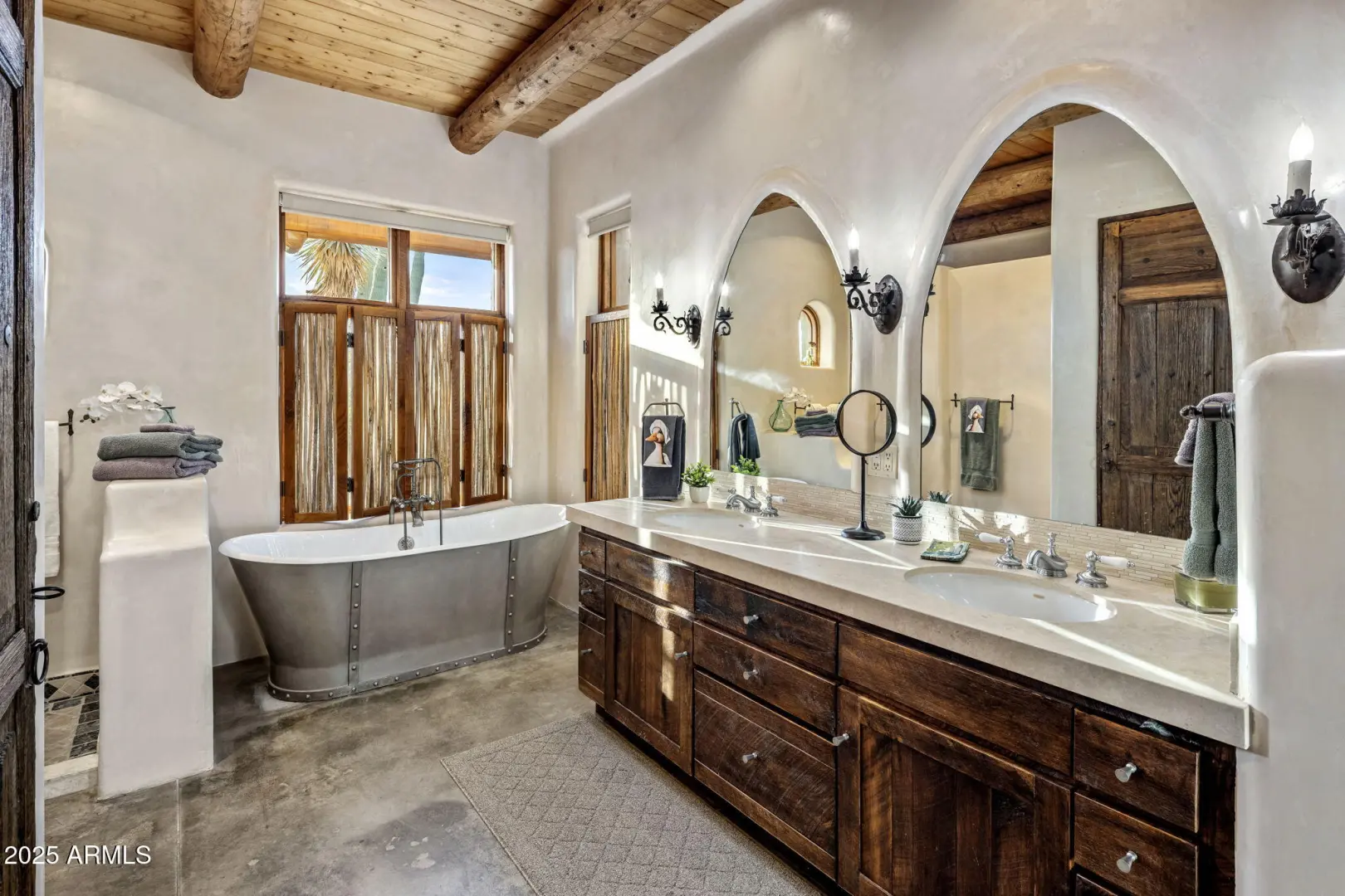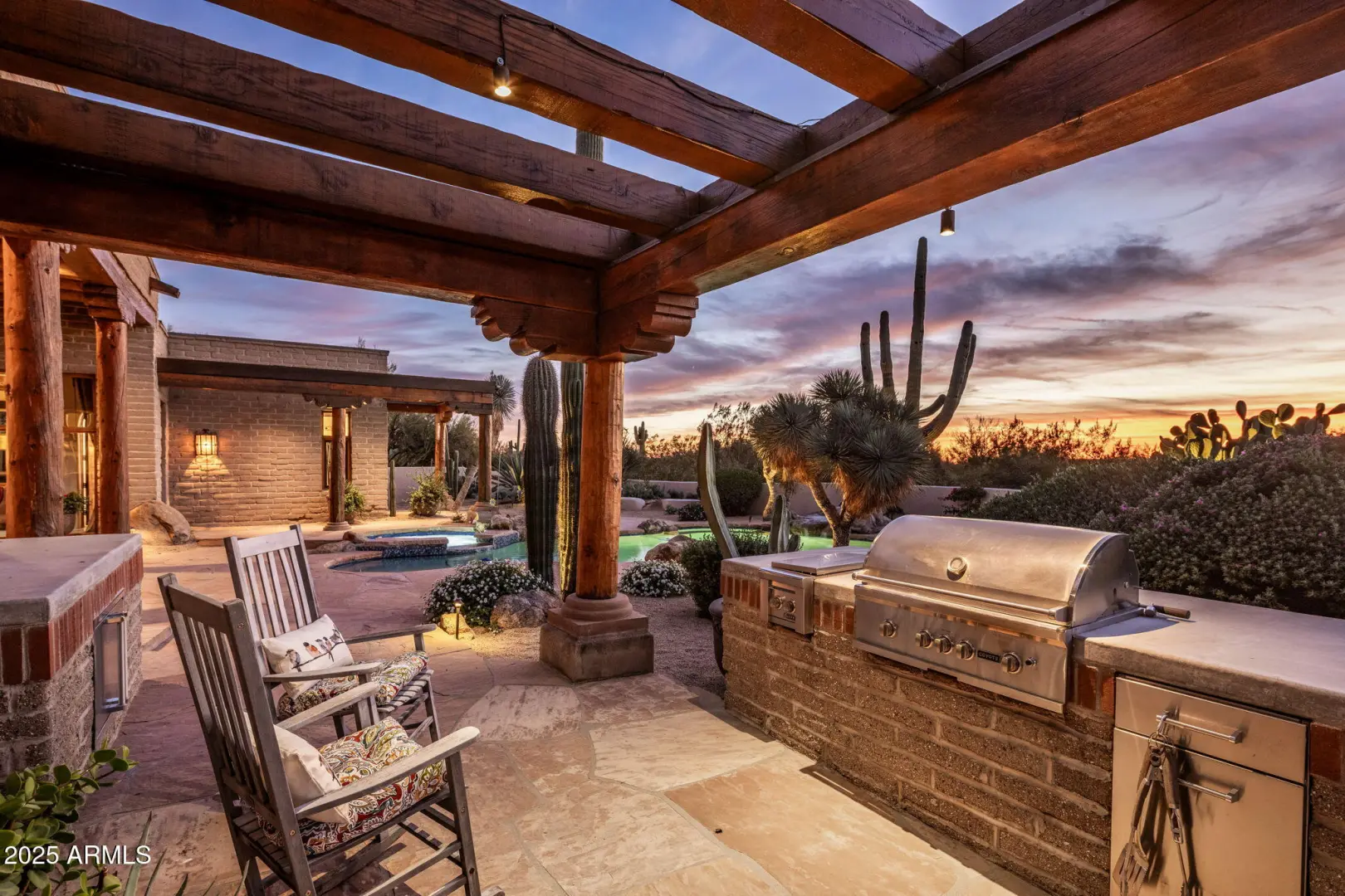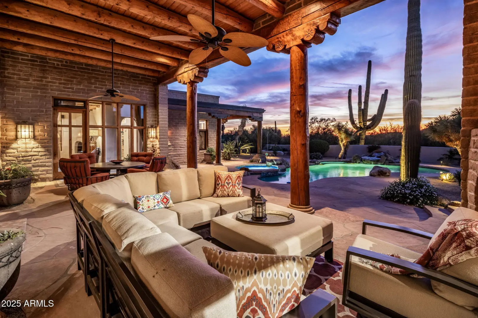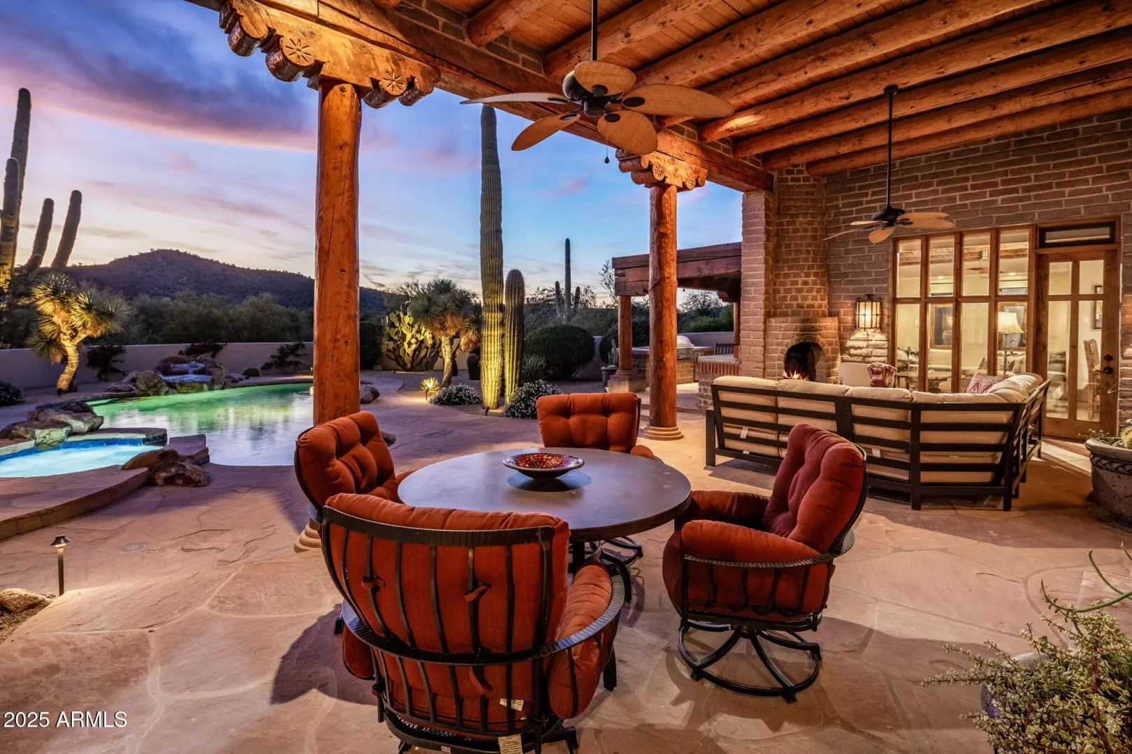 Authentic Southwest charm meets timeless luxury in this custom Tom Archer-built estate located in the exclusive guard-gated community of Sincuidados. Crafted with true Adobe brick construction, this home exudes character and quality throughout. Perfectly positioned on over an acre of privacy with quiet interior placement, it captures sweeping mountain views and breathtaking sunsets. Inside, rich architectural details abound, from tongue-and-groove ceilings with viga beams to hand-carved pilasters and corbels, Venetian-plastered walls, and antique doors. The thoughtfully designed floor plan features 3 bedrooms and 3.5 baths, highlighted by warm concrete floors, 3 interior gas fireplaces, and a chef's kitchen with honed granite countertops, quarter-sawn treatment cabinets, and stainless