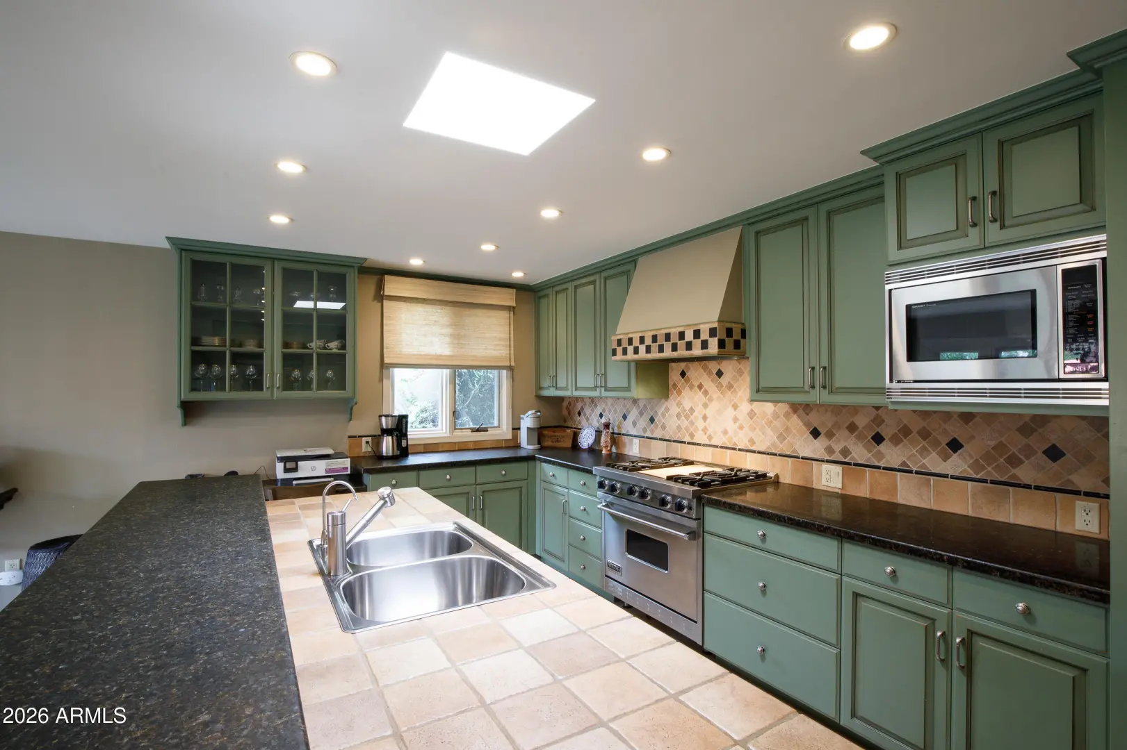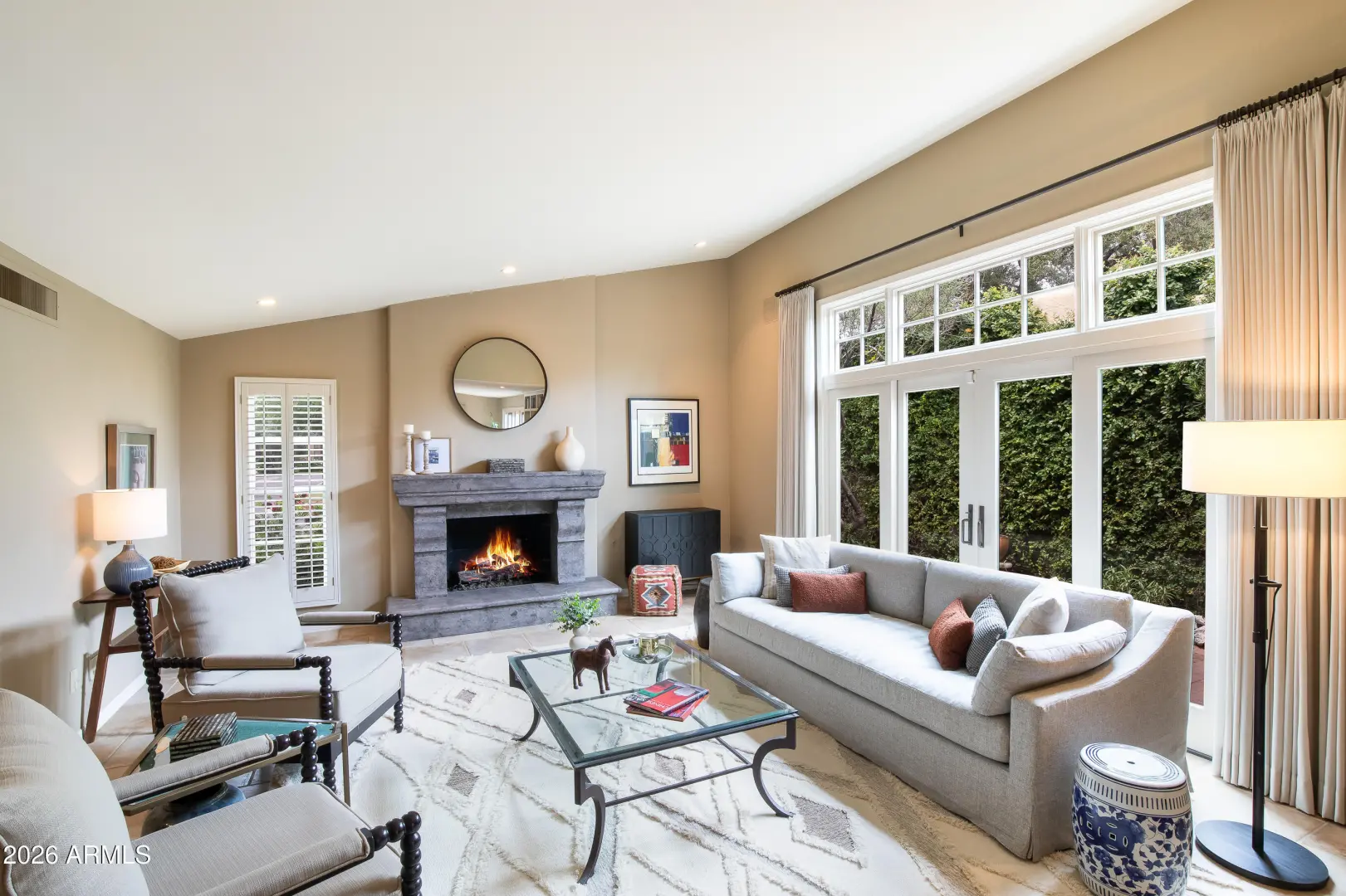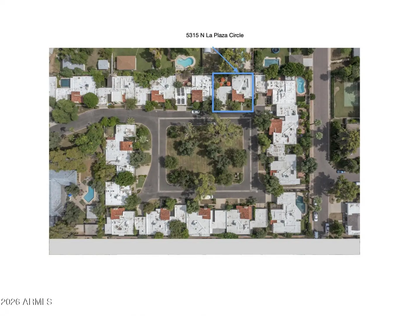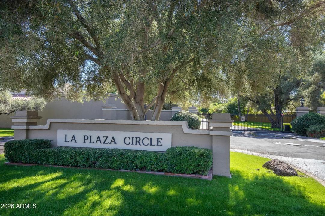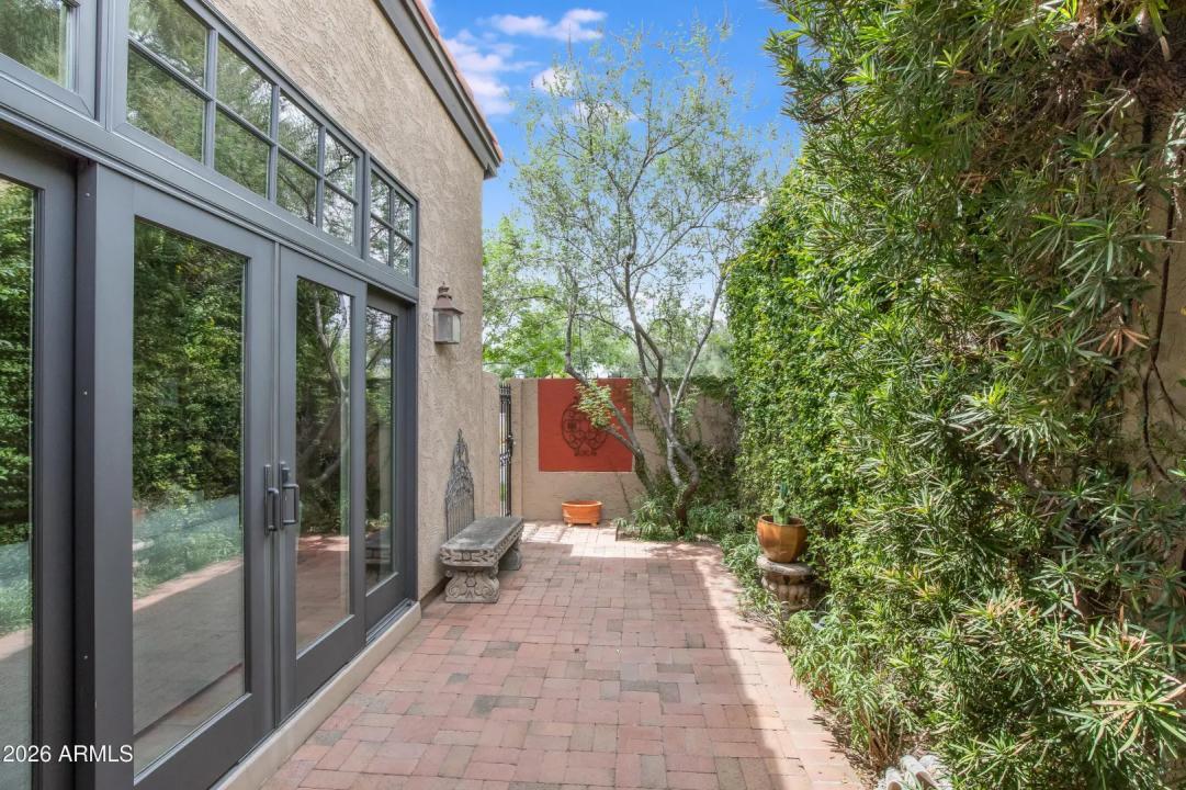 La Plaza Hermosa is a private oasis in the heart of North Central Phoenix, centered around a lush park setting. This single-level home offers refined, lock-&-leave living in one of the area's most coveted gated communities. Vaulted ceilings, abundant natural light, & multiple sliding glass doors create seamless indoor-outdoor flow. Designer finishes include Pella dual-pane windows, Sub-Zero refrigerator, Viking gas range, custom cabinetry, recessed lighting, & a striking gas fireplace. The serene primary suite features wood-beamed ceilings, a sitting area & patio access. The 2BR + den main home (2,086 sq ft) is complemented by a detached 182 sq ft studio with mini-split--ideal for office or gym. Lush, magazine-worthy courtyard& prime access to dining, shopping, & the Murphy Bridle Path