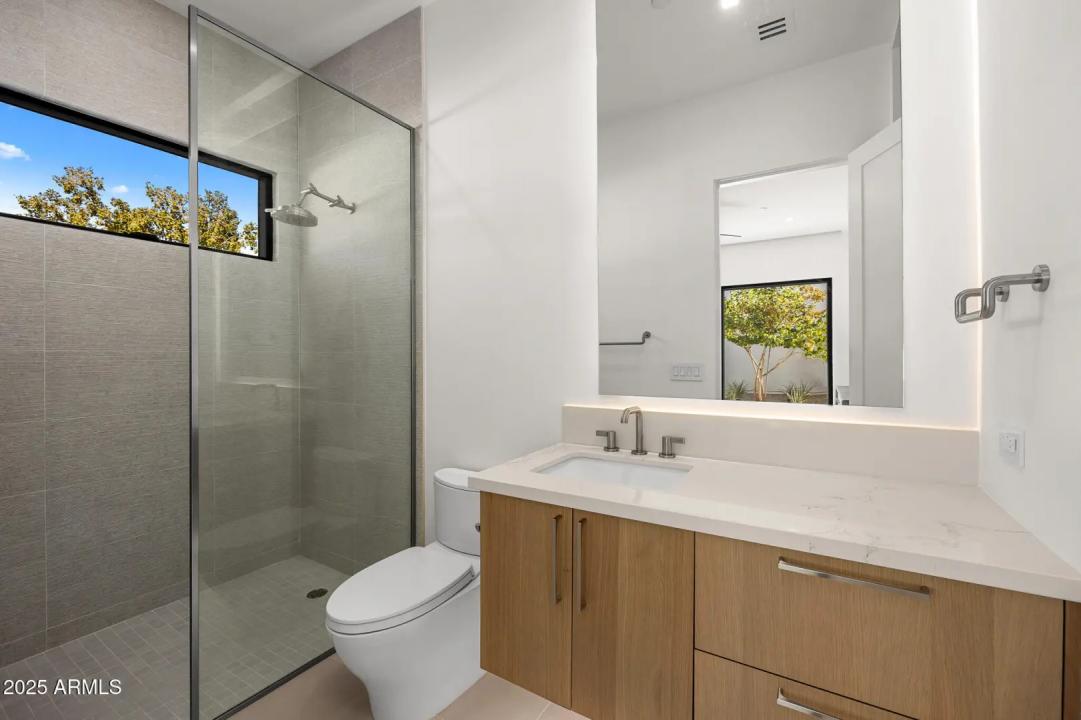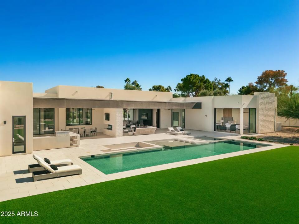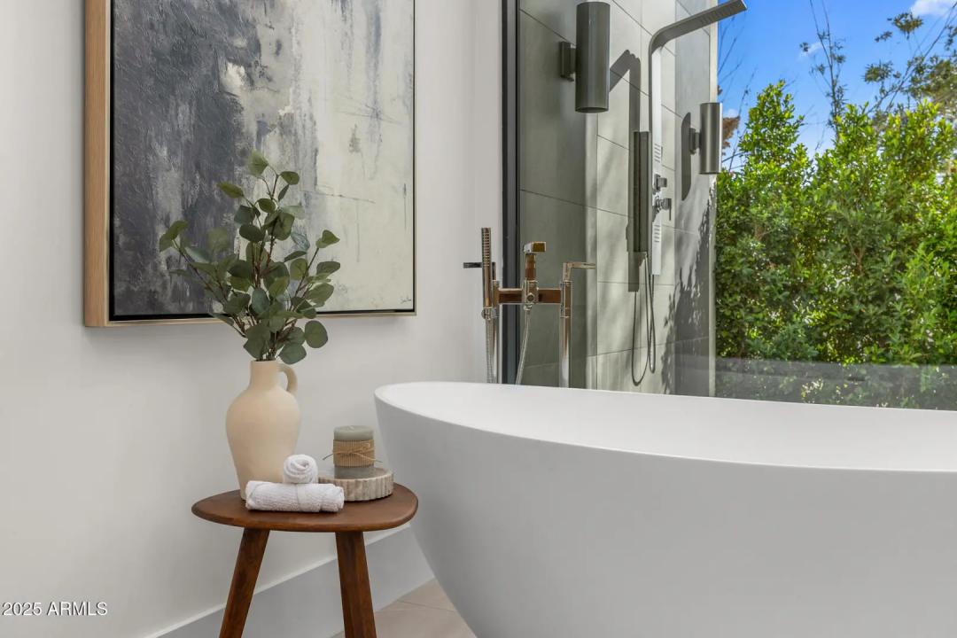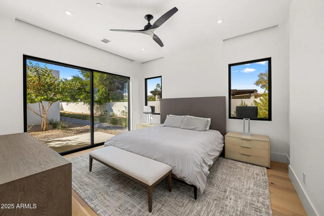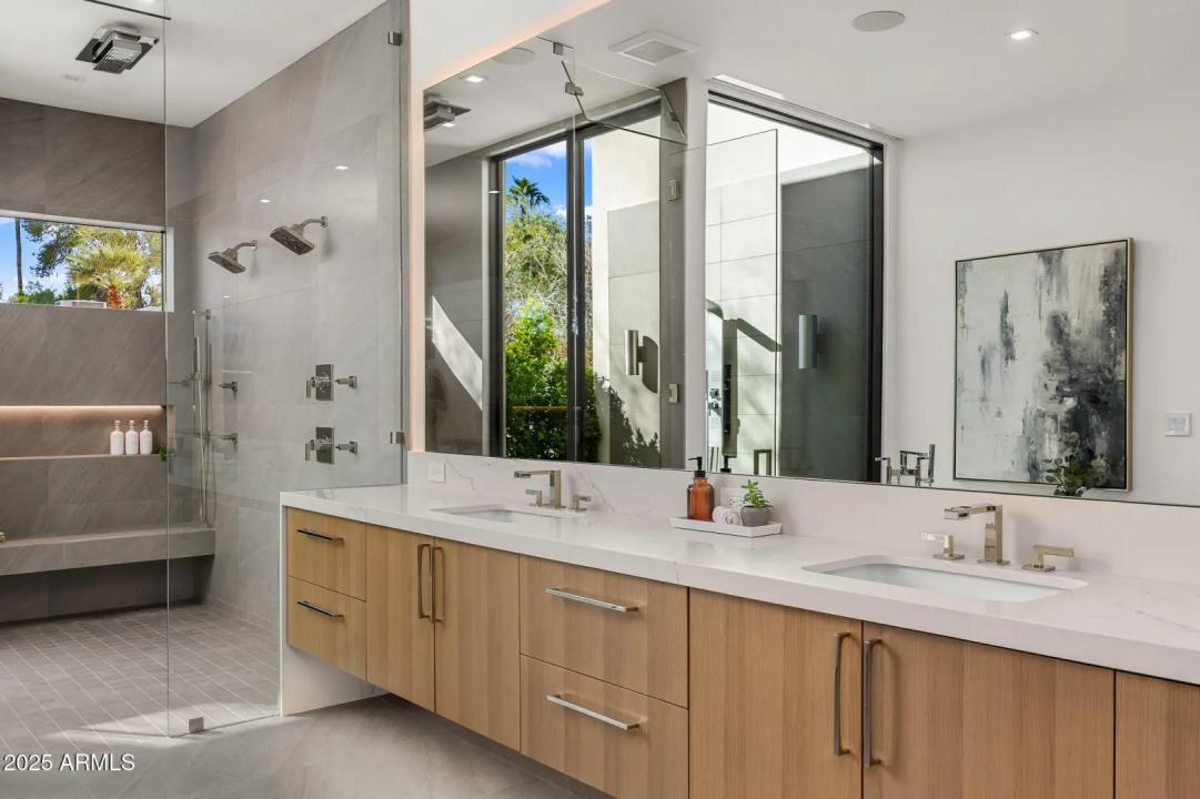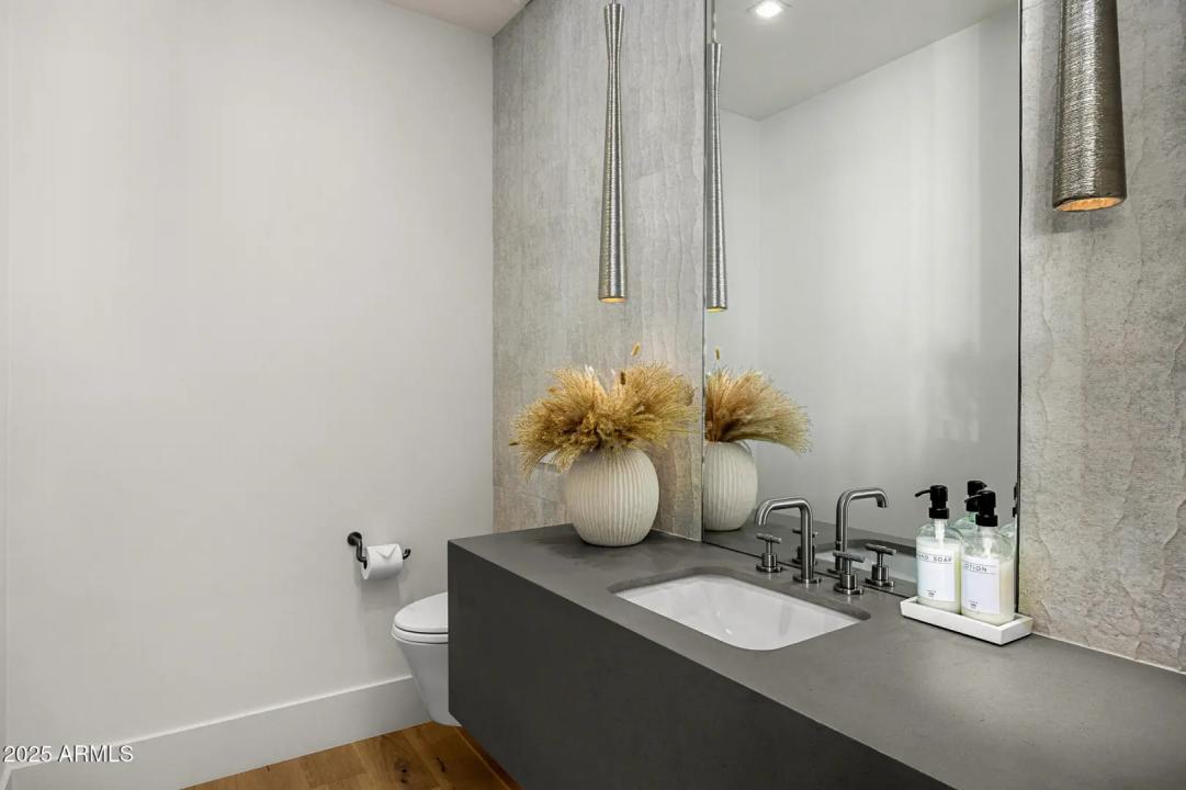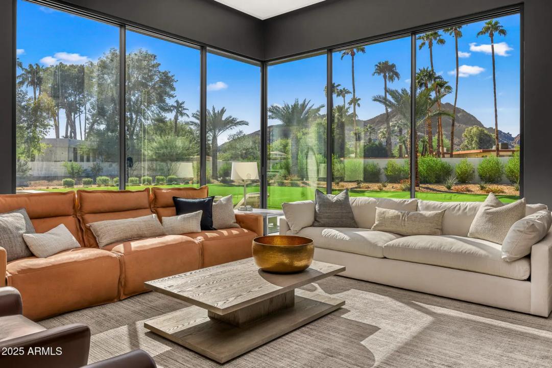 With its modern architecture, striking curb appeal, and sweeping Camelback Mtn views, this gated home with full guest house is truly the one you've been waiting for. This private estate offers 5 bedrooms, 7 bathrooms, a 6+ car garage, dedicated office, and a home gym, all wrapped in chic design and serene living spaces. The primary retreat is an inviting sanctuary, featuring telescoping doors, a cozy fireplace, and a convenient coffee station. The luxurious primary bath includes an impressive walk-in closet with double islands, a washer and dryer, dual vanities with a makeup area, a soaking tub, a walk-in shower, and even a privately enclosed outdoor shower. The guest wing includes its own secondary family room, a theater with projection screen, and three en-suite guest bedrooms.