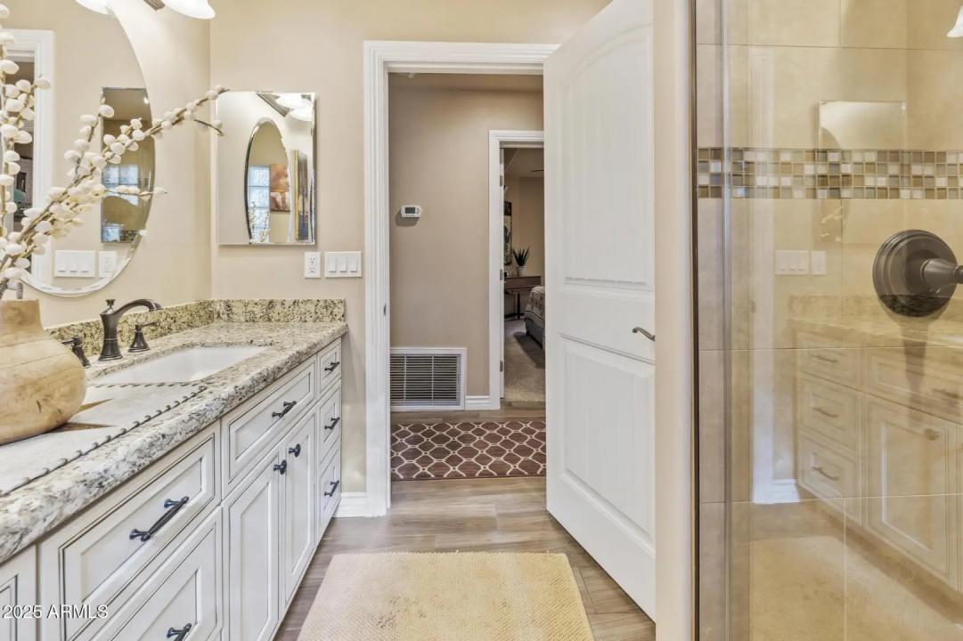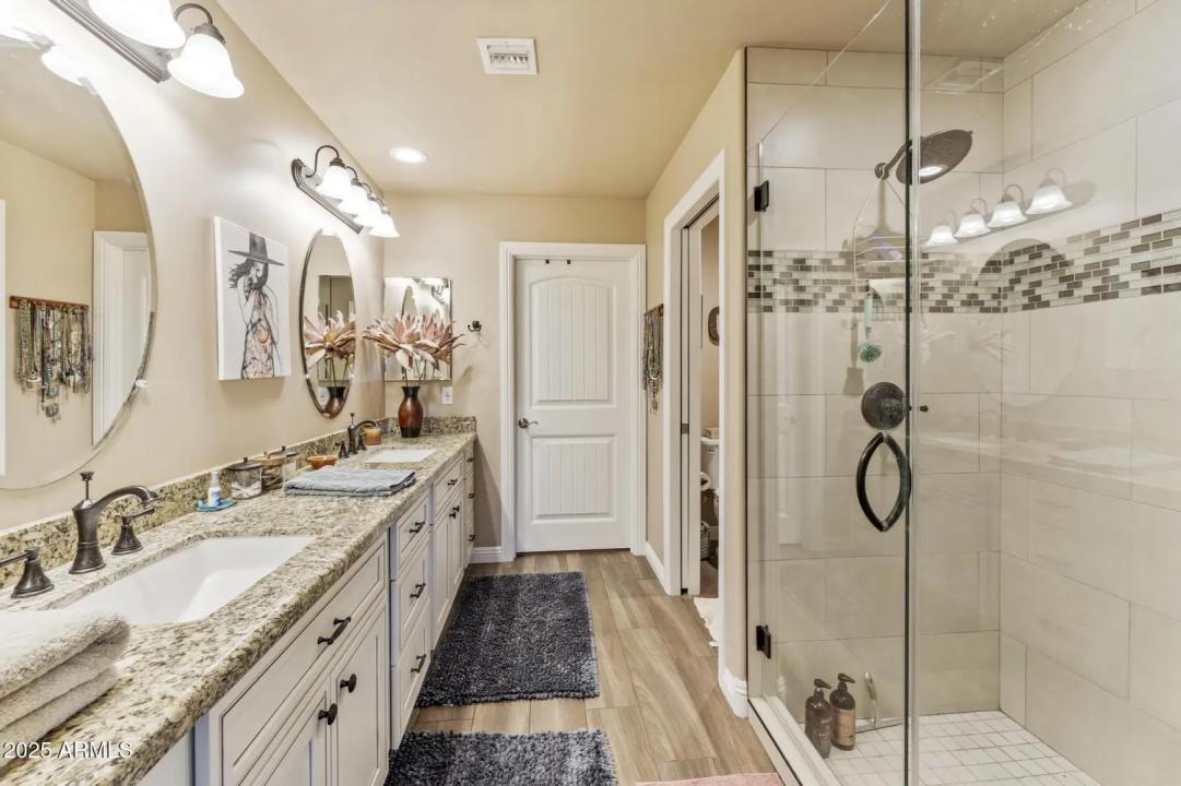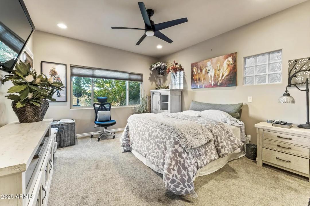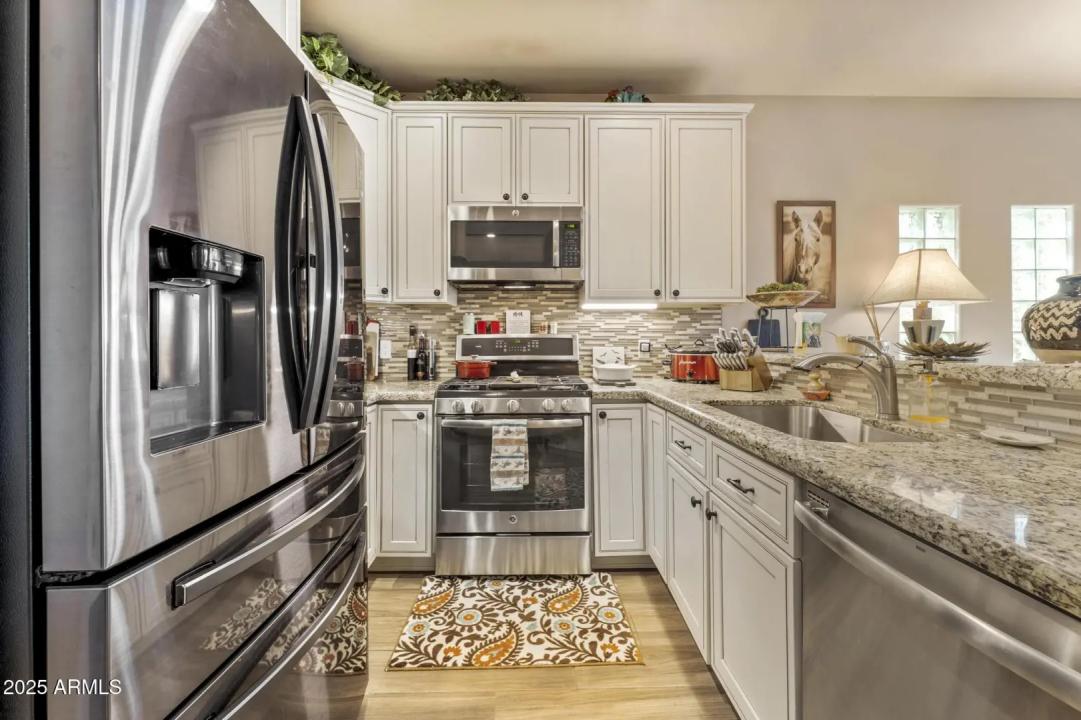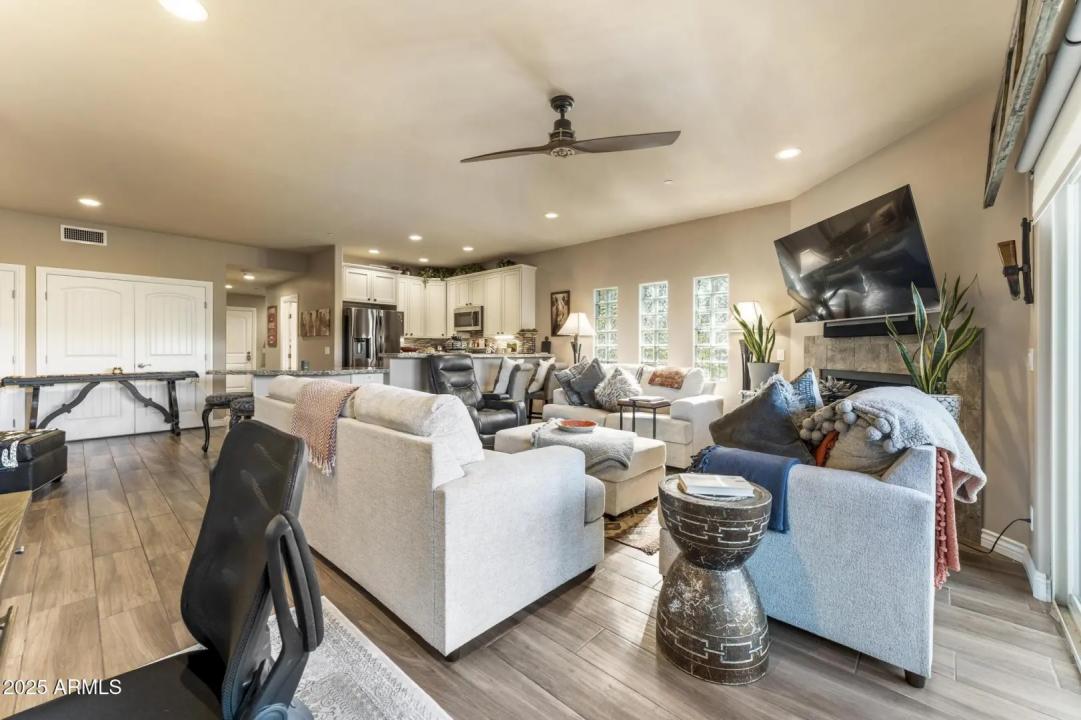 Welcome to modern desert living in the heart of Cave Creek. Tucked within an exclusive enclave just steps from the town's best dining, shopping, and trail systems, this beautifully upgraded residence blends high-end finishes with effortless lock-and-leave convenience. Inside, you'll find soaring ceilings, gorgeous wood-plank tile flooring, ceiling fans throughout, and a cozy fireplace—perfect for those chilly Arizona evenings. Large windows frame breathtaking sunset and mountain views, bringing the beauty of Cave Creek right into your living space. The gourmet kitchen is both stylish and functional, featuring granite countertops, a breakfast bar, stainless steel appliances, a glass-tile backsplash, and abundant custom distressed cabinetry. The open-concept layout flows seamlessly into t