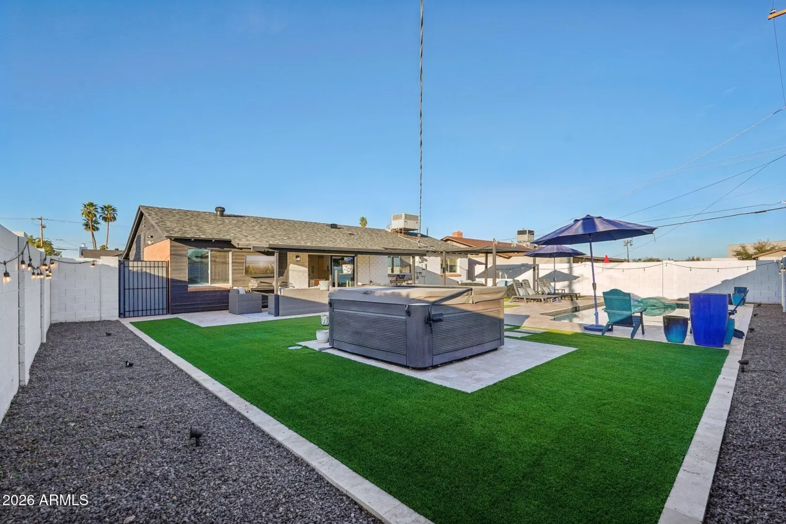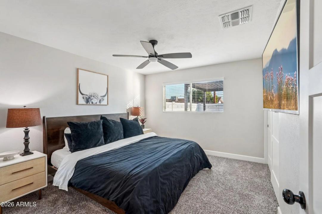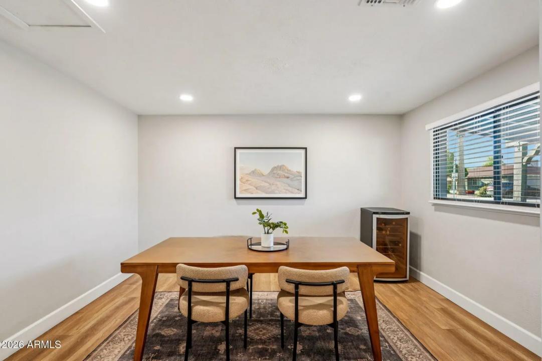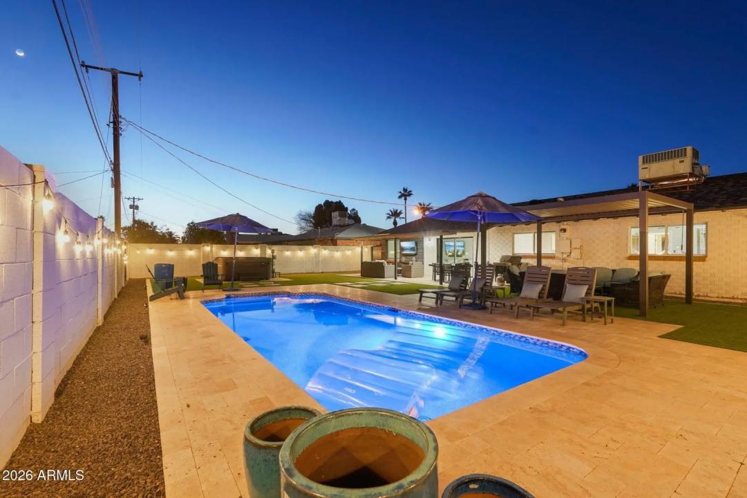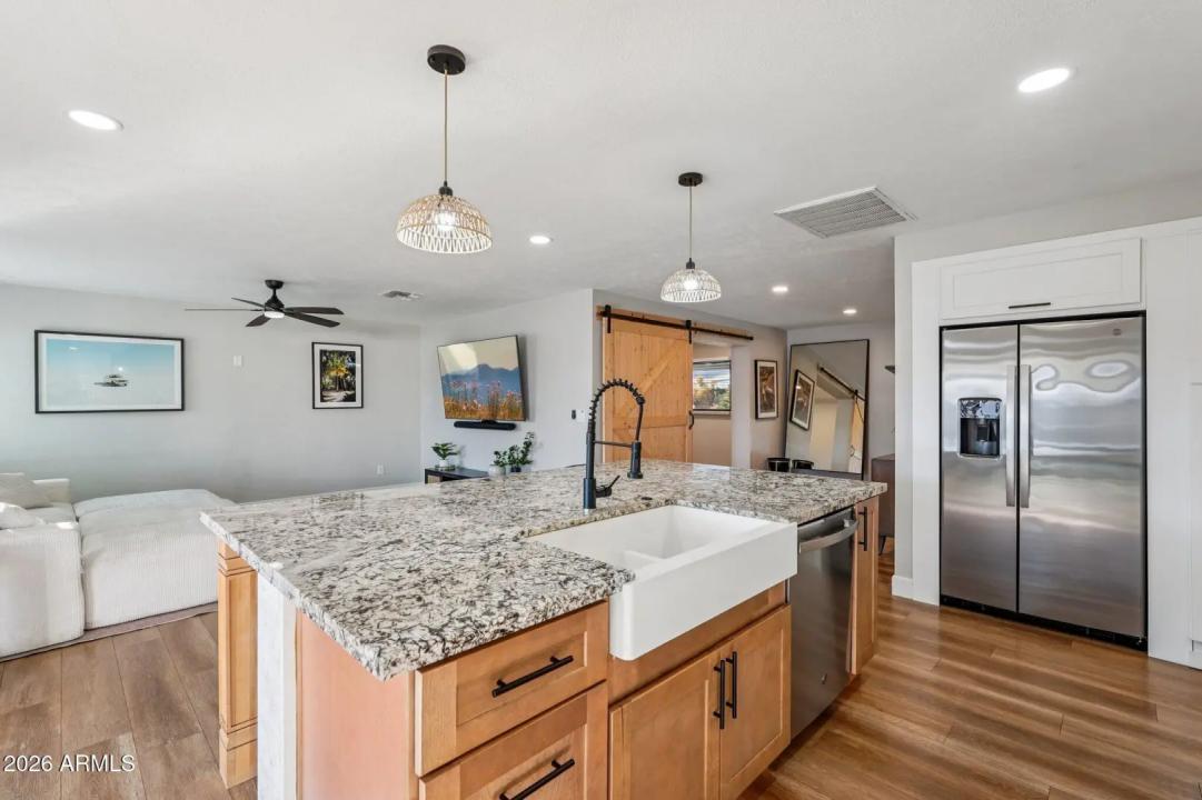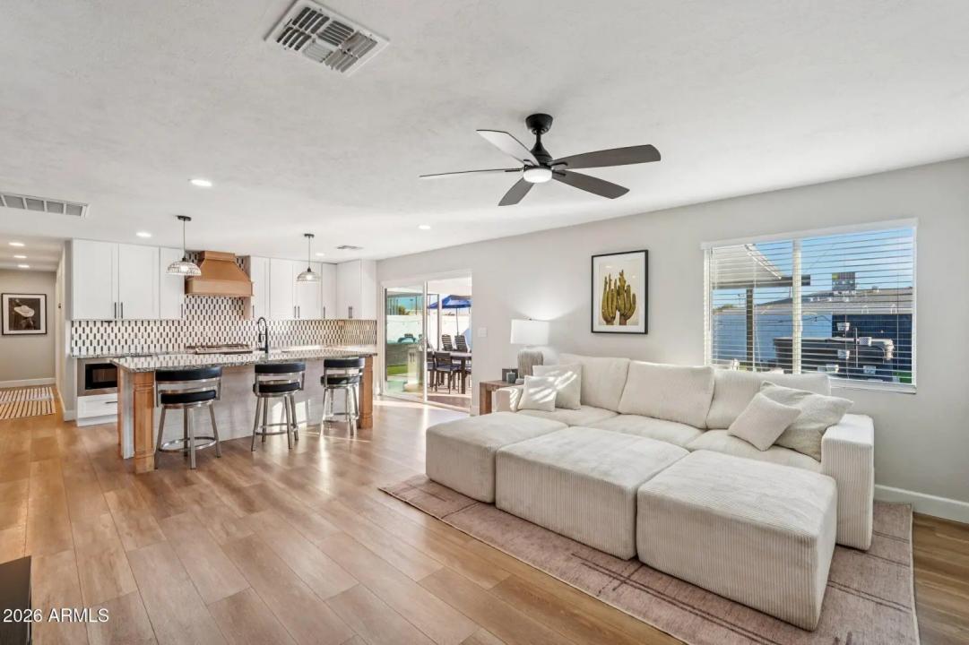 Fully remodeled Scottsdale retreat with resort-style backyard! This beautifully updated 3-bedroom, 2-bath residence blends modern design, functionality, and exceptional outdoor living in one of Scottsdale's most desirable locations. A charming front porch and newly redesigned front yard with fresh landscaping and enhanced curb appeal welcome you inside to a bright, open-concept layout. The stunning chef's kitchen is the centerpiece of the home, showcasing white shaker cabinetry, granite countertops, stainless steel appliances, custom tile backsplash, and a spacious island with breakfast bar seating. The adjacent dining space is ideal for entertaining.