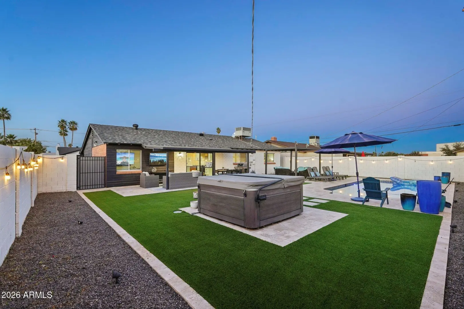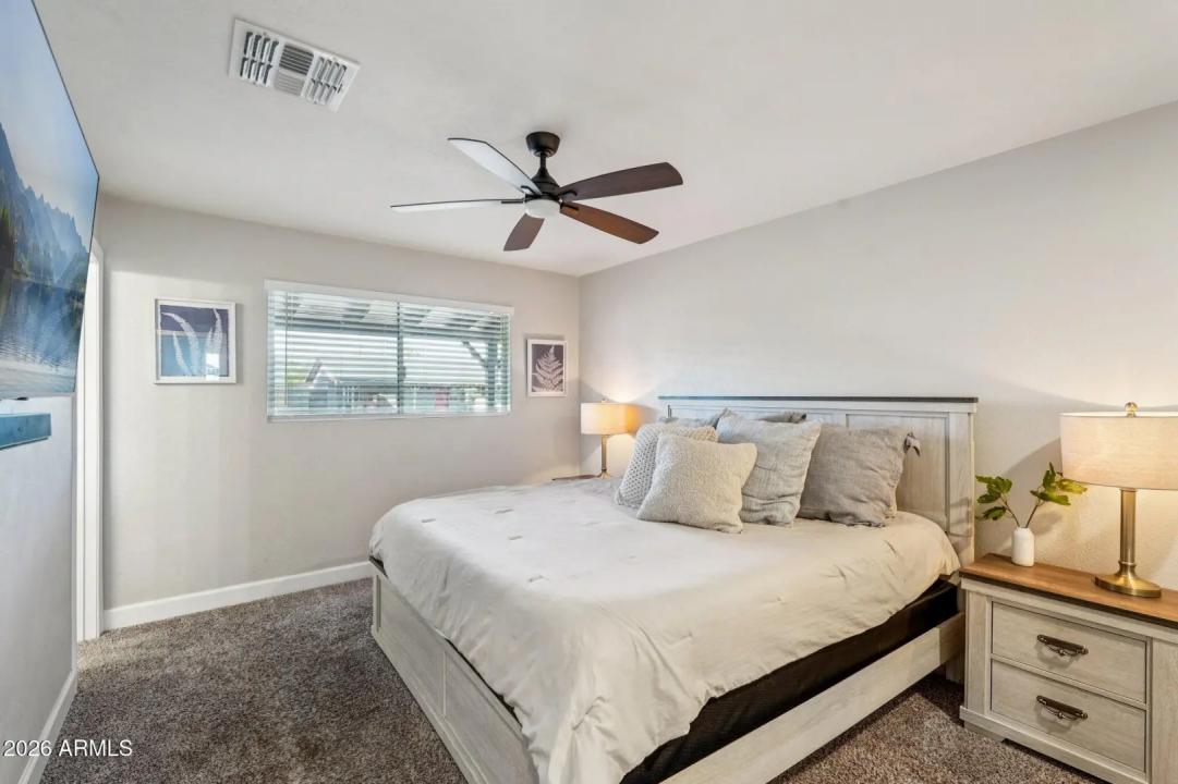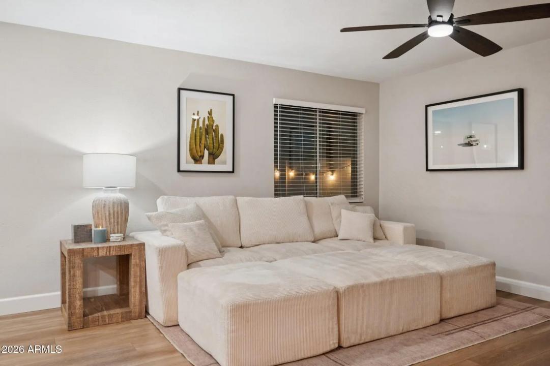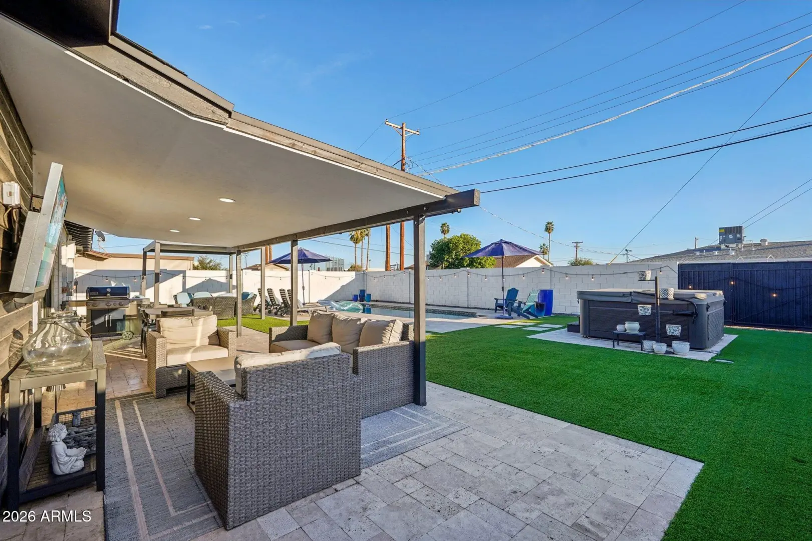 Fully remodeled Scottsdale retreat with resort-style backyard! This beautifully updated 3-bedroom, 2-bath residence blends modern design, functionality, and exceptional outdoor living in one of Scottsdale's most desirable locations. A charming front porch and newly redesigned front yard with fresh landscaping and enhanced curb appeal welcome you inside to a bright, open-concept layout. The stunning chef's kitchen is the centerpiece of the home, showcasing white shaker cabinetry, granite countertops, stainless steel appliances, custom tile backsplash, and a spacious island with breakfast bar seating. The adjacent dining space is ideal for entertaining.